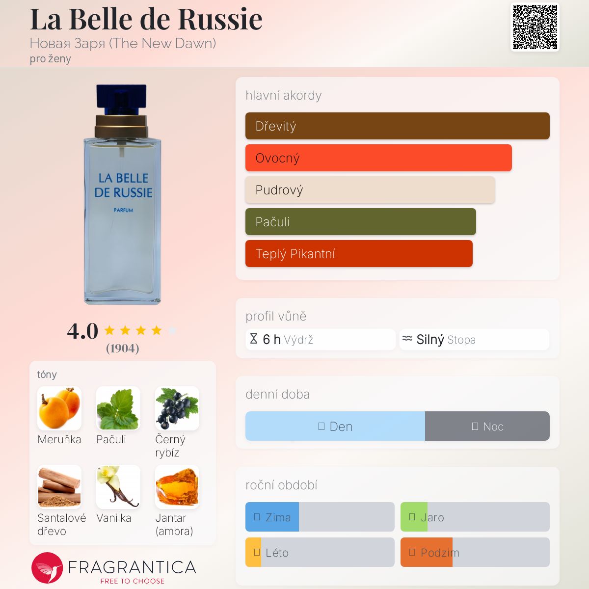 La Belle de Russie podle Новая Заря (The New Dawn) je Floral Woody Musk vůně pro ženy. La Belle de Russie byl/a uveden/a v roce 1980. Vrchní tóny jsou Černý rybíz, Karafiát a Lotus; střední tóny jsouMeruňka, Kosatec, Pižmo a Jasmín ; základní tóny jsou Pačuli, Santalové dřevo, Vanilka, Jantar (ambra) a Virginský cedr.