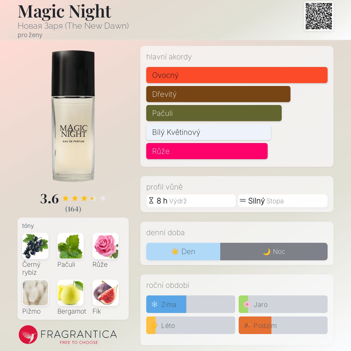 Magic Night podle Новая Заря (The New Dawn) je Floral Fruity vůně pro ženy. Vrchní tóny jsou Černý rybíz, Bergamot a Fík; střední tóny jsouRůže, Jasmín a Konvalinka ; základní tóny jsou Pačuli, Pižmo a Jahoda.
