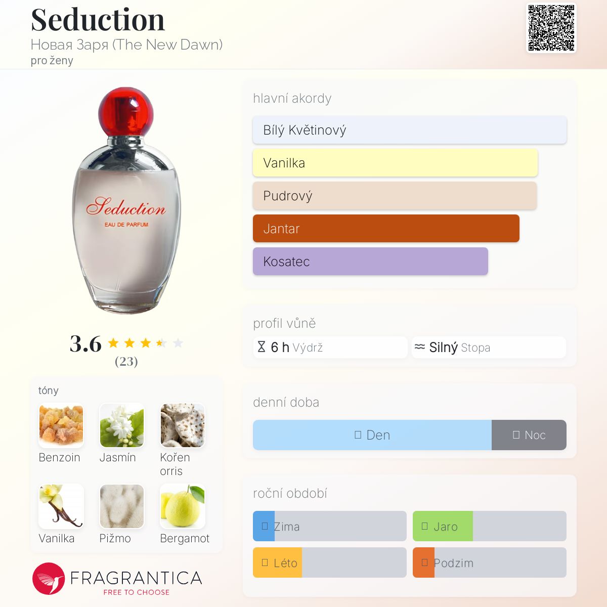 Seduction podle Новая Заря (The New Dawn) je Aromatic Fougere vůně pro ženy. Seduction byl/a uveden/a v roce 2008. Vrchní tón je Bergamot ; střední tóny jsouJasmín, Kořen orris, Lilie a Růže ; základní tóny jsou Benzoin, Vanilka a Pižmo.