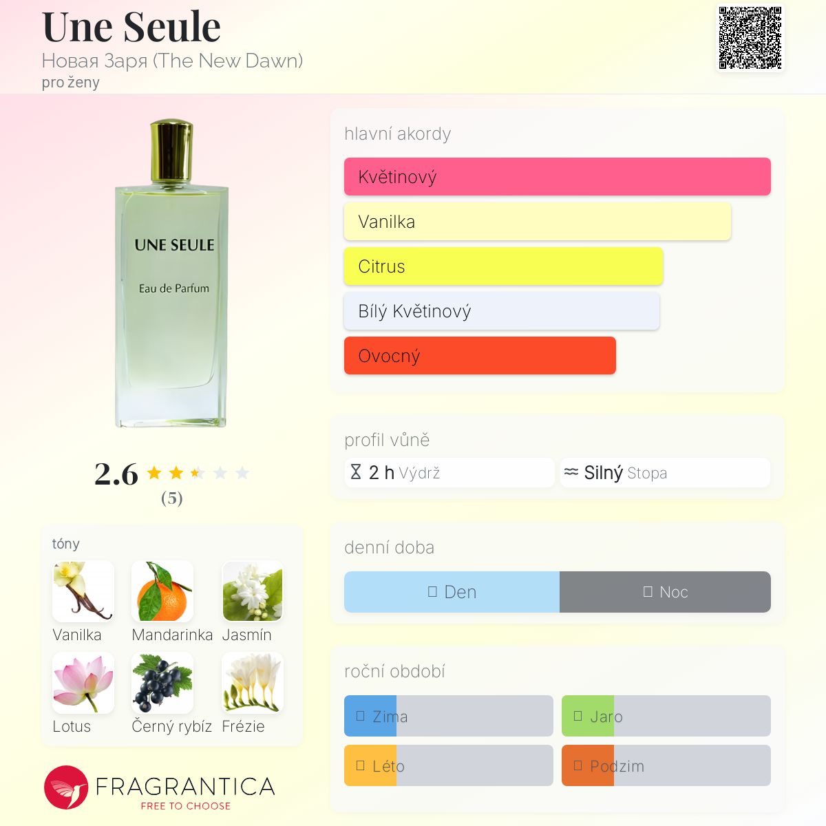 Une Seule podle Новая Заря (The New Dawn) je Floral Fruity vůně pro ženy. Vrchní tóny jsou Mandarinka a Černý rybíz; střední tóny jsouJasmín, Lotus, Frézie a Růže ; základní tóny jsou Vanilka a Cedr.