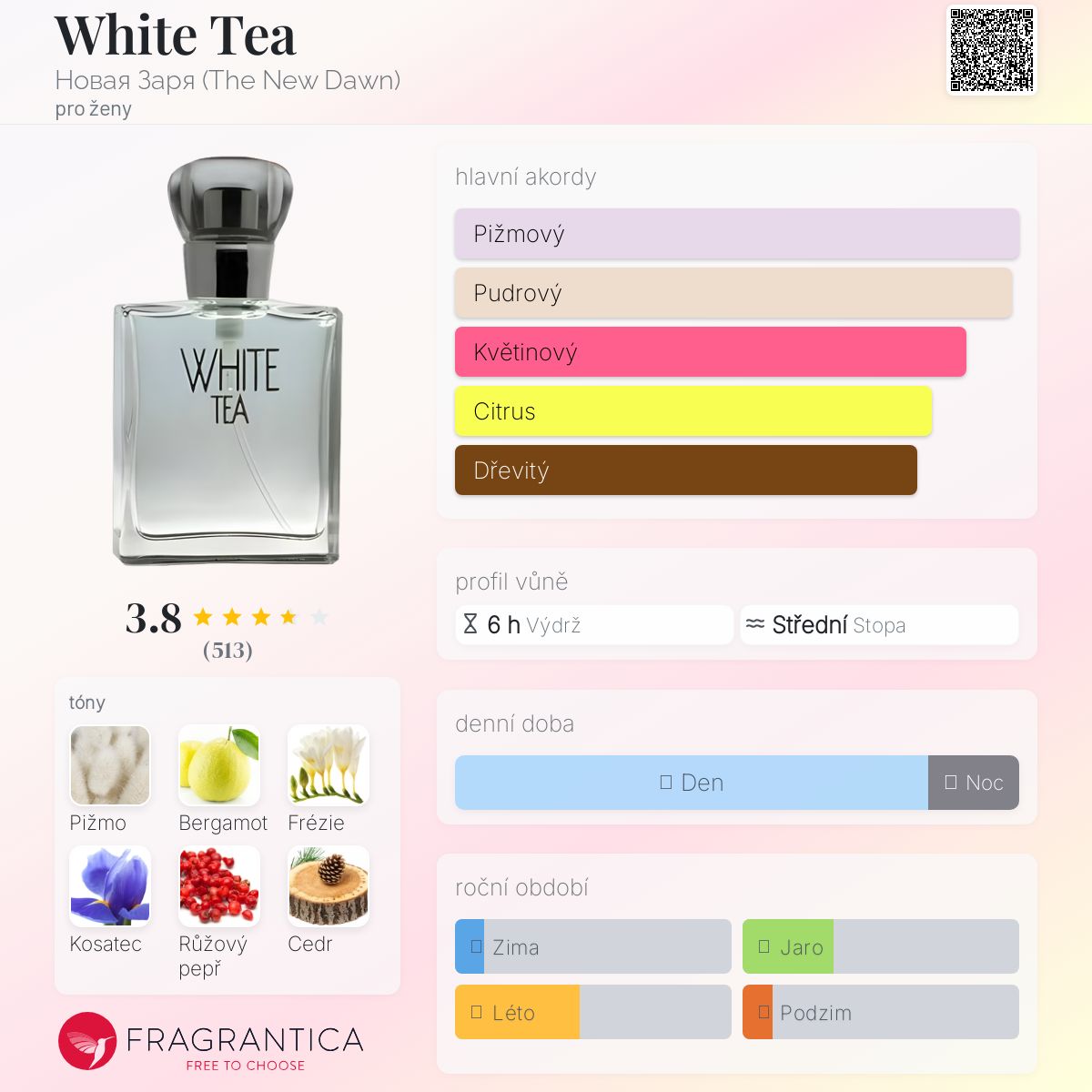 White Tea podle Новая Заря (The New Dawn) je Floral Green vůně pro ženy. White Tea byl/a uveden/a v roce 2003. Vrchní tóny jsou Bergamot a Růžový pepř; střední tóny jsouFrézie a Kosatec ; základní tóny jsou Pižmo, Virginský cedr a Jantar (ambra).