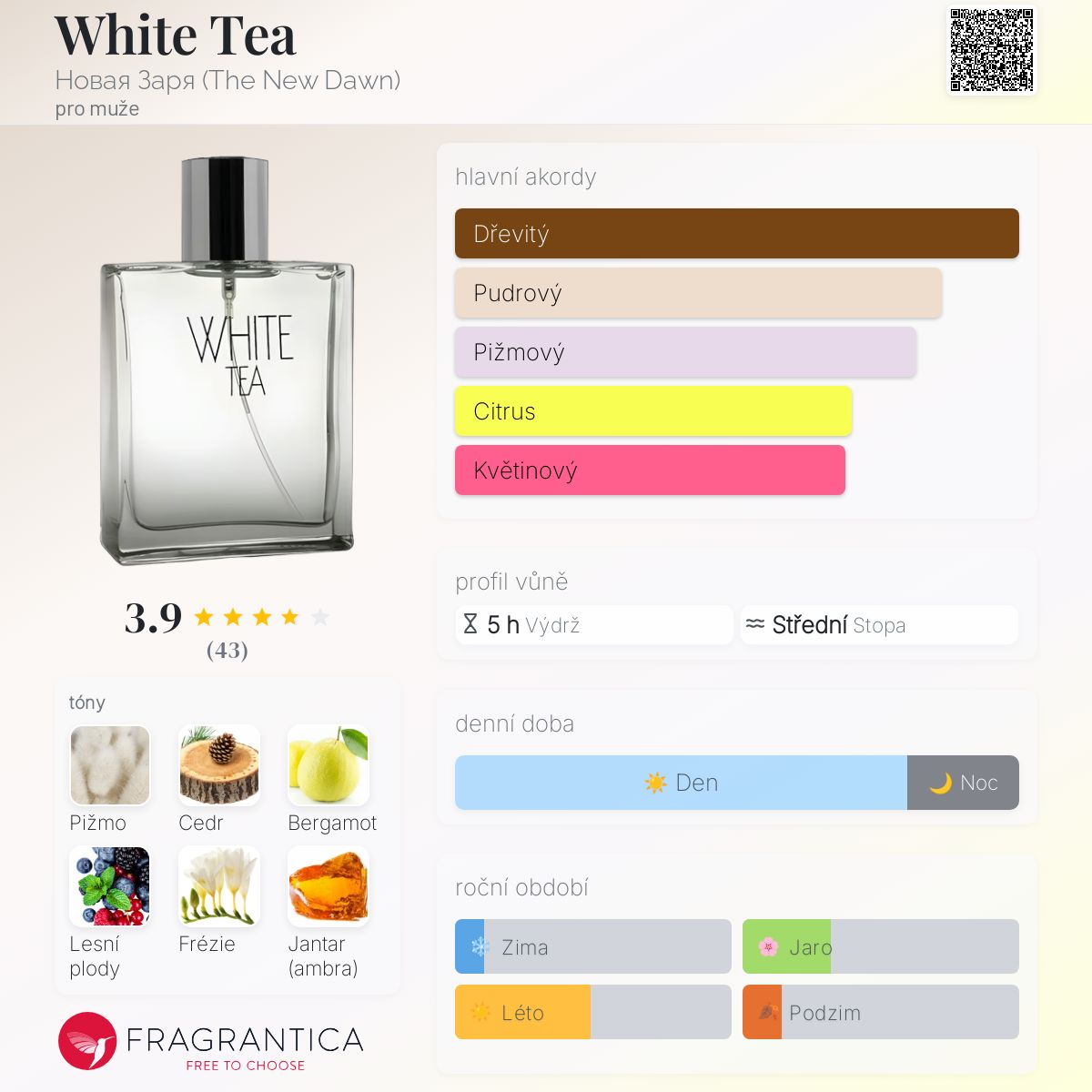 White Tea podle Новая Заря (The New Dawn) je Aromatic Aquatic vůně pro muže. White Tea byl/a uveden/a v roce 2004. Vrchní tóny jsou Bergamot a Lesní plody; střední tóny jsouFrézie a Kosatec ; základní tóny jsou Bílé pižmo, Cedr a Jantar (ambra).