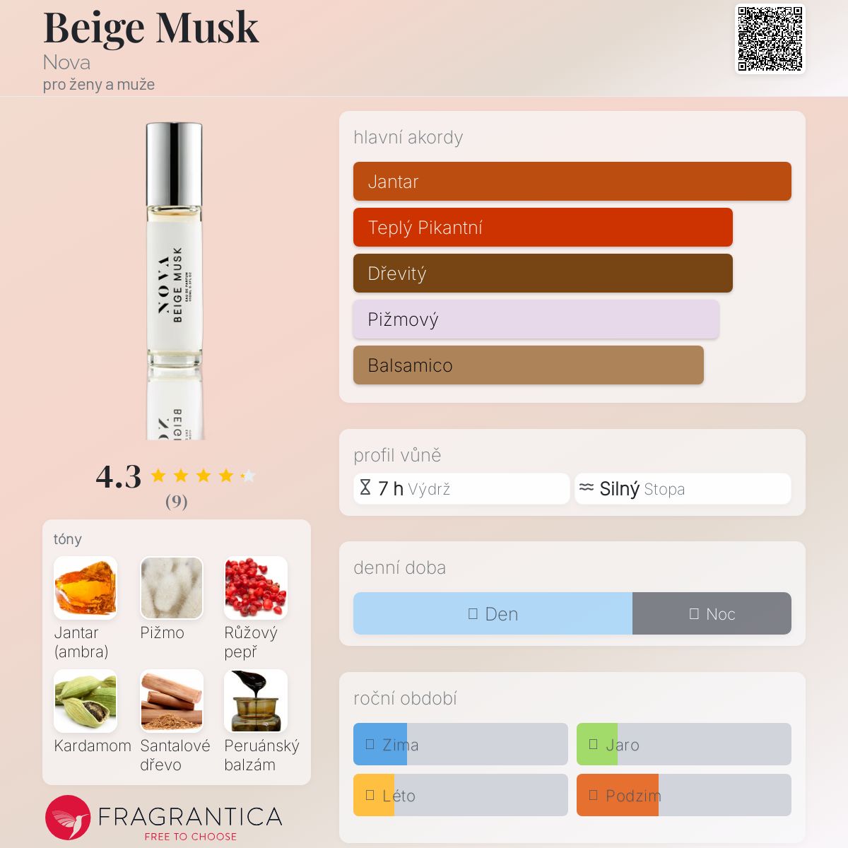 Beige Musk podle Nova je Floral Fruity vůně pro ženy a muže. Beige Musk byl/a uveden/a v roce 2016. "Nosem" za touto vůní je Julia Zangrilli.