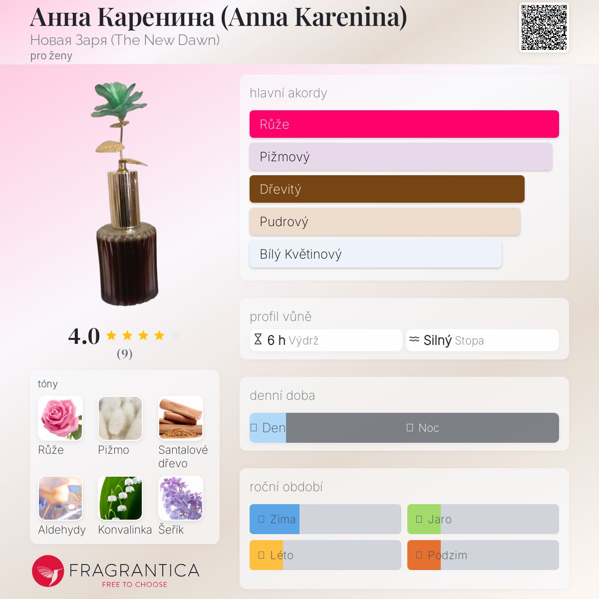 Анна Каренина (Anna Karenina) podle Новая Заря (The New Dawn) je Floral vůně pro ženy. Анна Каренина (Anna Karenina) byl/a uveden/a v roce 1975. "Nosem" za touto vůní je Ivan Orlyuk. Vrchní tóny jsou Aldehydy, Konvalinka, Šeřík, Mandarinka a Gardénie; střední tóny jsouRůže, Vetiver, Tuberóza, Vanilka a Pačuli ; základní tóny jsou Pižmo, Santalové dřevo a Syntetická cibetka.
