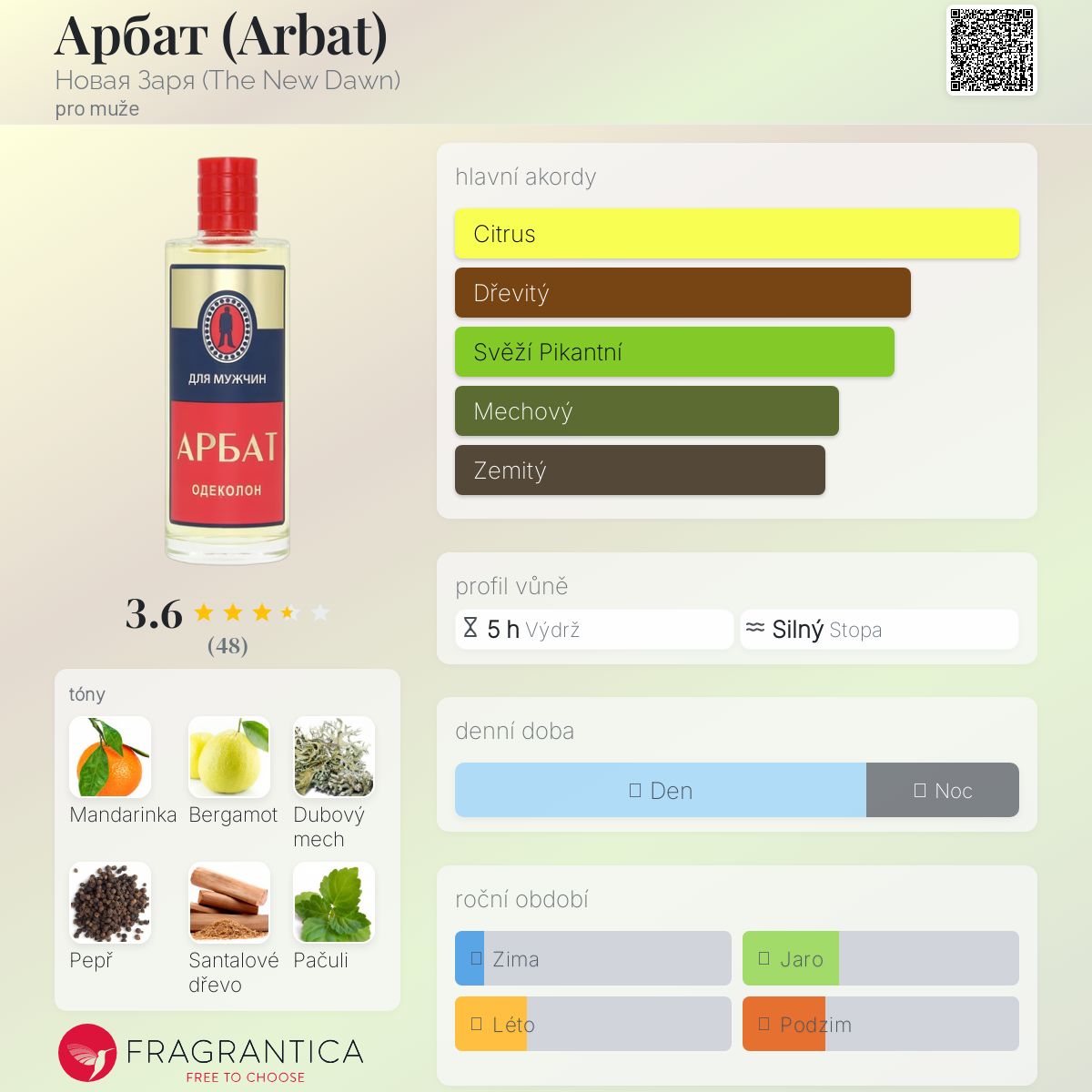 Арбат (Arbat) podle Новая Заря (The New Dawn) je Woody Aromatic vůně pro muže. Арбат (Arbat) byla spuštěna během 1970. Vrchní tóny jsou Mandarinka, Bergamot, Šalvěj a Levandule; střední tóny jsouPepř, Pačuli a Fialkový list ; základní tóny jsou Dubový mech, Santalové dřevo, Pižmo a Jantar (ambra).