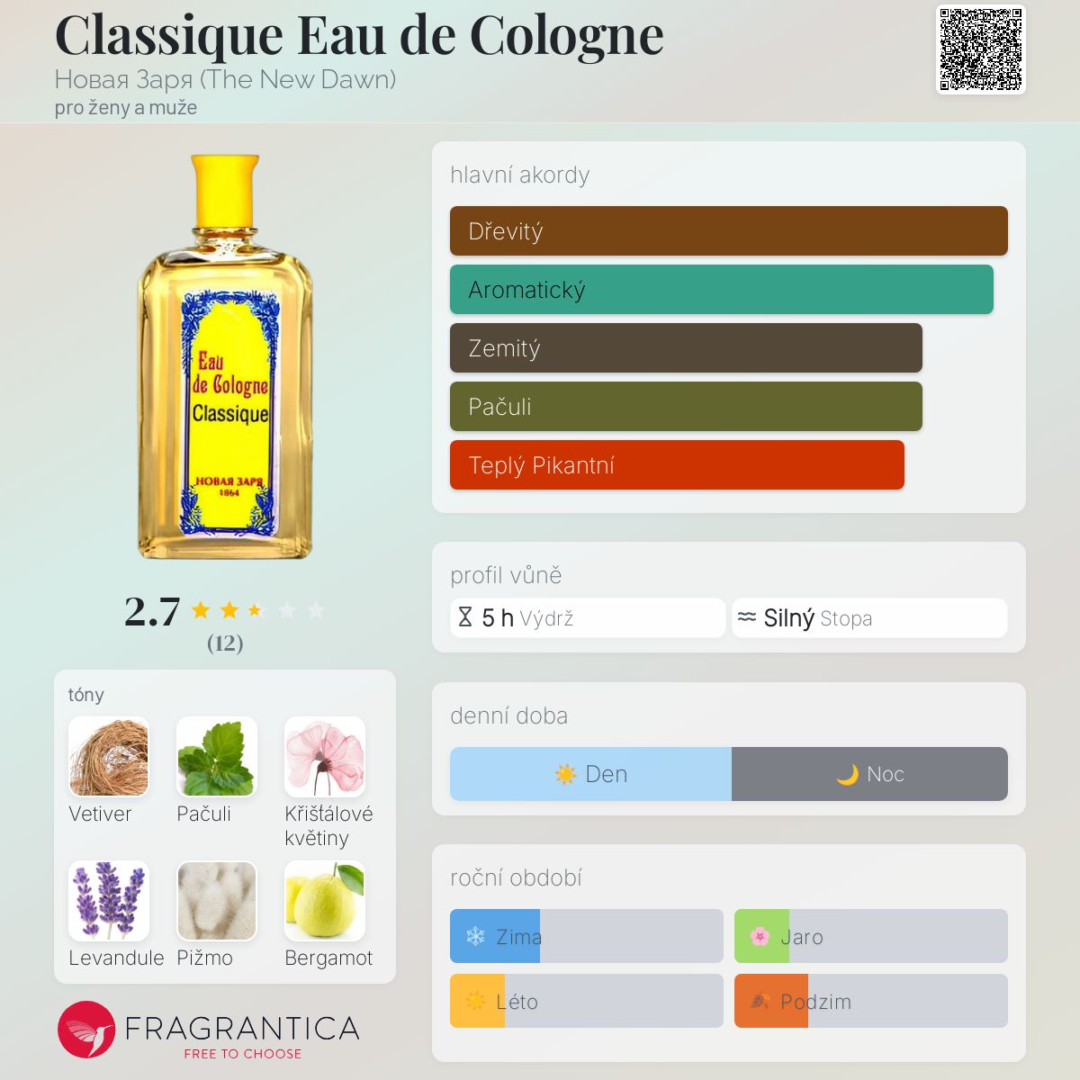 Classique Eau de Cologne podle Новая Заря (The New Dawn) je Citrus Aromatic vůně pro ženy a muže. Toto je nová vůně. Classique Eau de Cologne byl/a uveden/a v roce 2025. Vrchní tóny jsou Bergamot, Kardamom a Citrón; střední tóny jsouVetiver, Křišťálové květiny a Levandule ; základní tóny jsou Pačuli, Pižmo a Cedr.