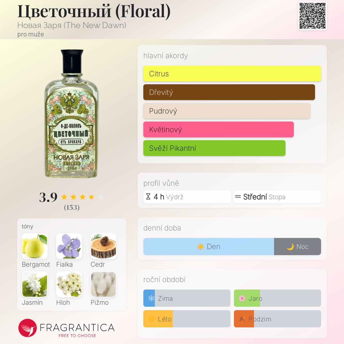 Цветочный (Floral) podle Новая Заря (The New Dawn) je Chypre Floral vůně pro muže. Цветочный (Floral) byl/a uveden/a v roce 1882. Vrchní tóny jsou Bergamot, Hloh a Broskev; střední tóny jsouFialka, Jasmín a Růže ; základní tóny jsou Cedr, Pižmo a Santalové dřevo.