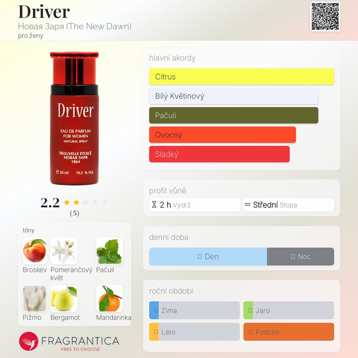 Driver podle Новая Заря (The New Dawn) je vůně pro ženy. Vrchní tóny jsou Bergamot a Mandarinka; střední tóny jsouBroskev a Pomerančový květ ; základní tóny jsou Pačuli a Pižmo.