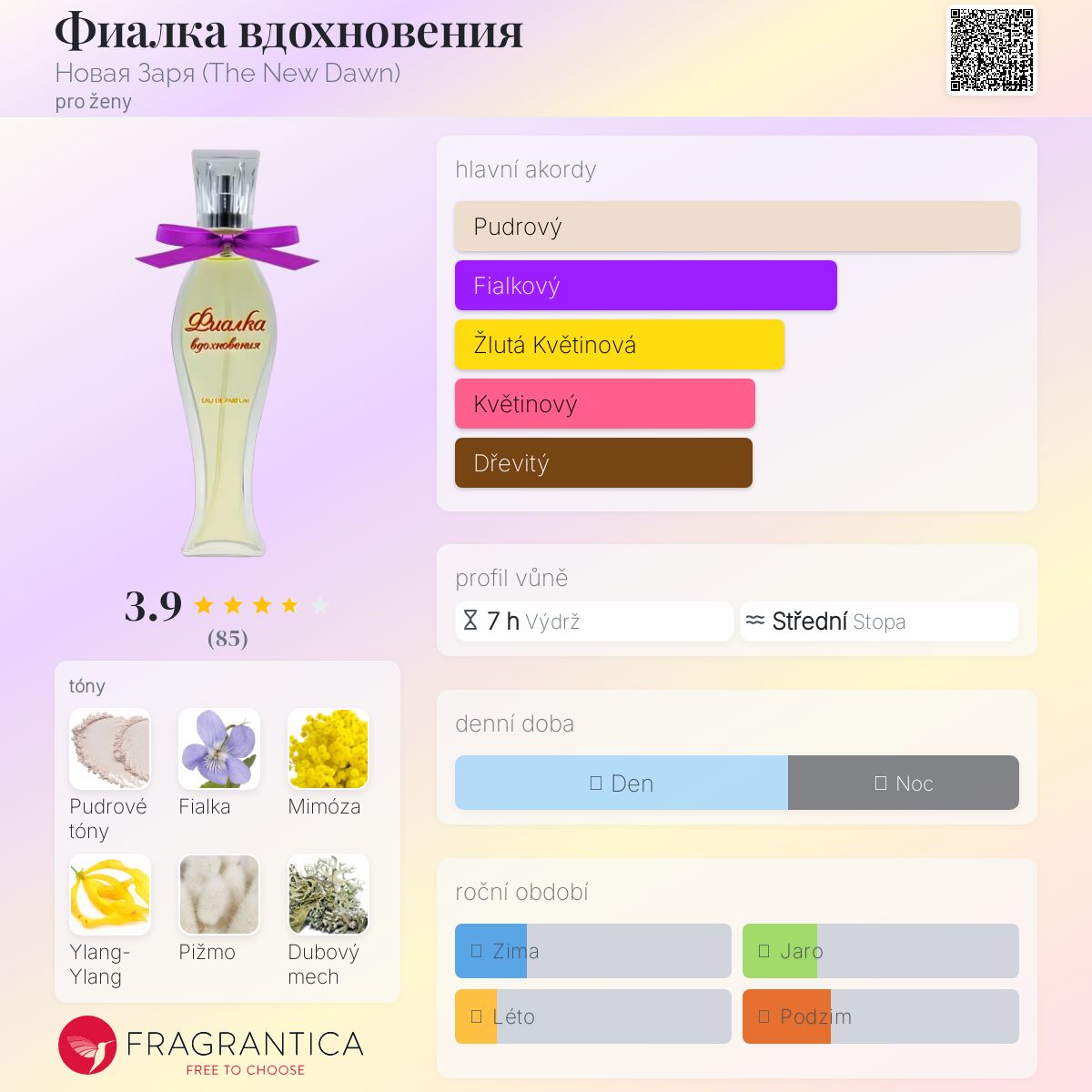 Фиалка вдохновения podle Новая Заря (The New Dawn) je Floral vůně pro ženy. Toto je nová vůně. Фиалка вдохновения byl/a uveden/a v roce 2024. Vrchní tóny jsou Citrón, Olibanum a Pepř; střední tóny jsouFialka, Mimóza a Ylang-Ylang ; základní tóny jsou Pudrové tóny, Pižmo, Mech a Labdanum.