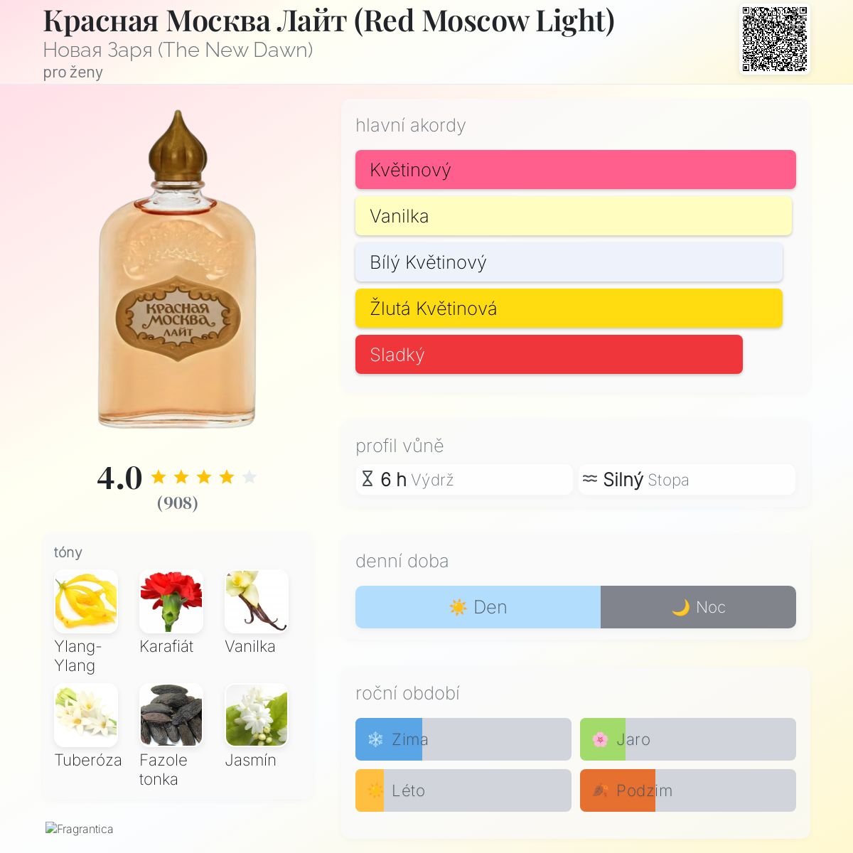 Красная Москва Лайт (Red Moscow Light) podle Новая Заря (The New Dawn) je Orientální Floral vůně pro ženy. Красная Москва Лайт (Red Moscow Light) byl/a uveden/a v roce 2018. Vrchní tóny jsou Ylang-Ylang, Karafiát a Bergamot; střední tóny jsouTuberóza, Jasmín a Růže ; základní tóny jsou Vanilka a Fazole tonka.