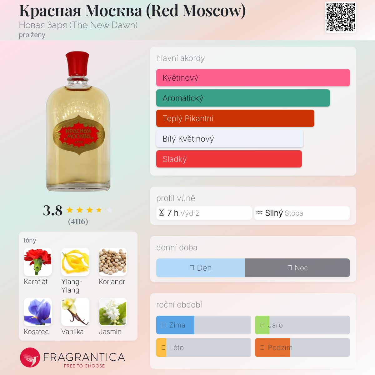Красная Москва (Red Moscow) podle Новая Заря (The New Dawn) je Orientální Floral vůně pro ženy. Красная Москва (Red Moscow) byl/a uveden/a v roce 1925. "Nosem" za touto vůní je Auguste Michel. Vrchní tóny jsou Koriandr, Pomerančový květ a Bergamot; střední tóny jsouKarafiát, Ylang-Ylang, Jasmín a Růže ; základní tóny jsou Kosatec, Vanilka a Fazole tonka.