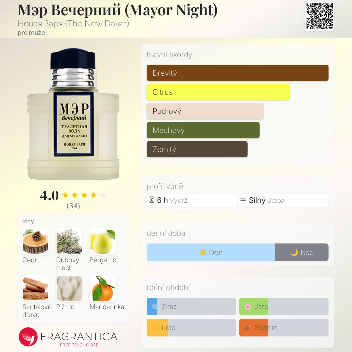 Мэр Вечерний (Mayor Night) podle Новая Заря (The New Dawn) je Woody Chypre vůně pro muže. Vrchní tóny jsou Bergamot, Mandarinka a Grapefruit; střední tóny jsouCedr a Santalové dřevo ; základní tóny jsou Dubový mech a Pižmo.