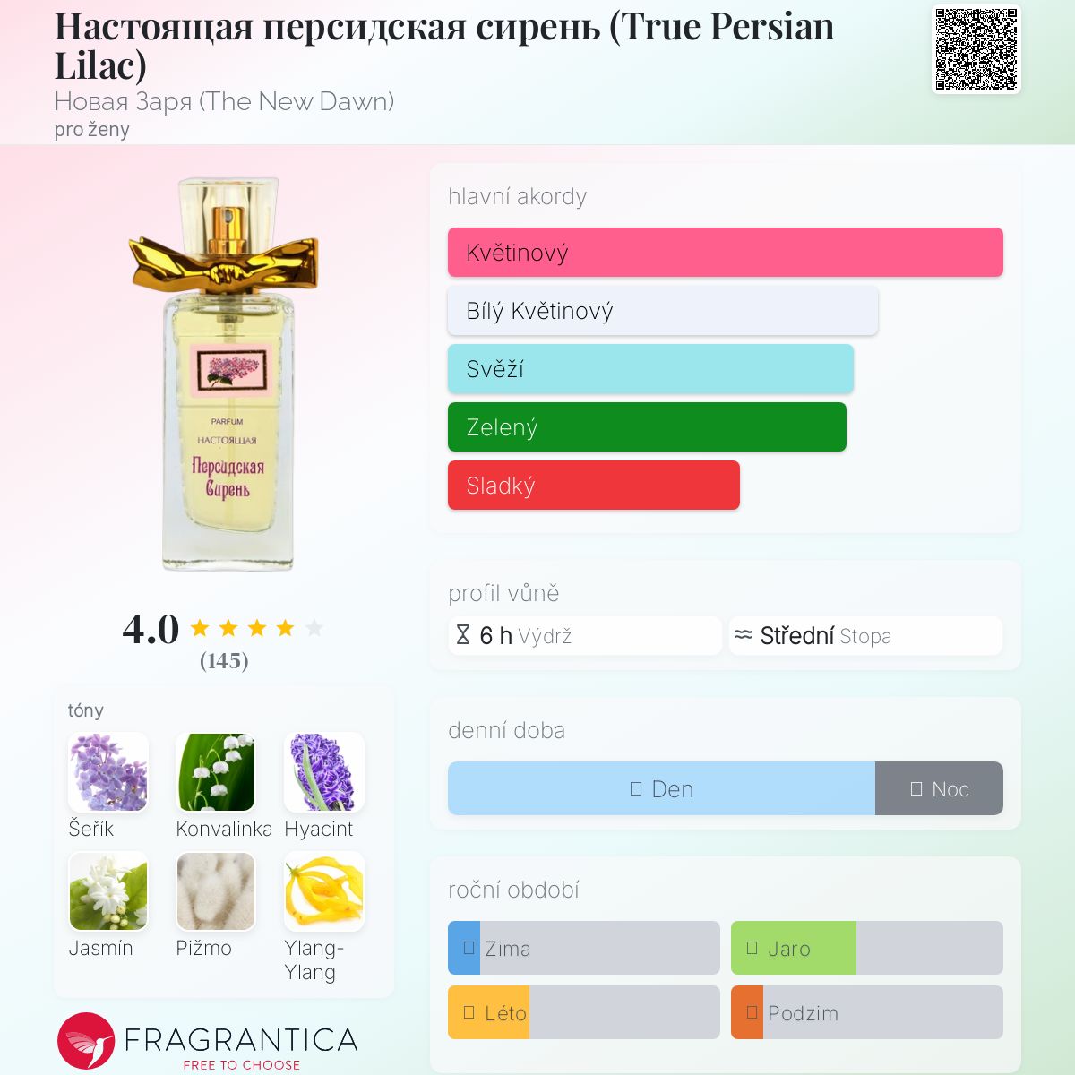 Настоящая персидская сирень (True Persian Lilaс) podle Новая Заря (The New Dawn) je Floral vůně pro ženy. Vrchní tóny jsou Hyacint, Ylang-Ylang a Červené bobule; střední tóny jsouŠeřík, Konvalinka, Jasmín a Karafiát ; základní tóny jsou Pižmo, Vanilka a Jantar (ambra).