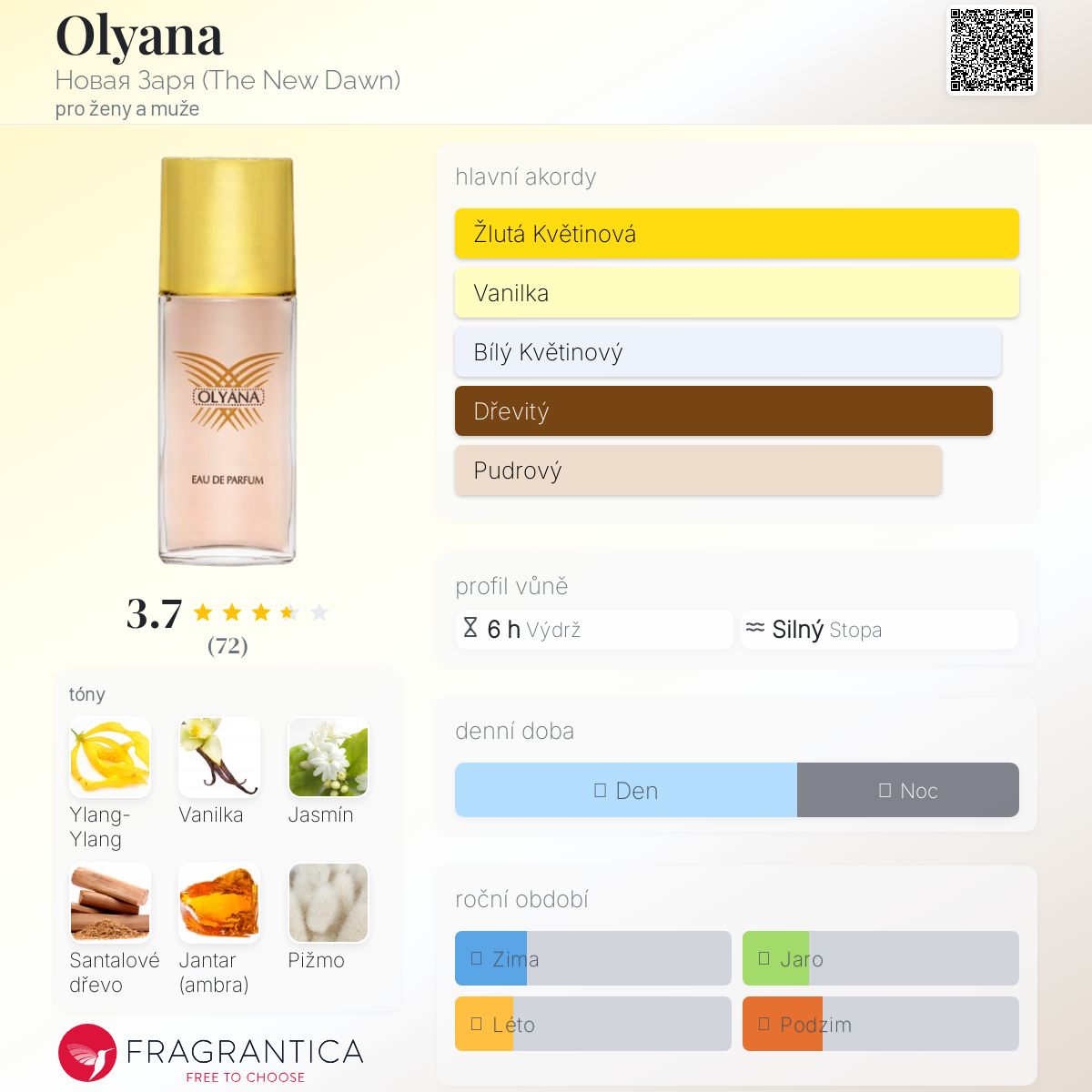 Olyana podle Новая Заря (The New Dawn) je Orientální Woody vůně pro ženy a muže. Vrchní tóny jsou Ylang-Ylang, Grapefruit a Bergamot; střední tóny jsouVanilka a Jasmín ; základní tóny jsou Santalové dřevo, Jantar (ambra) a Pižmo.