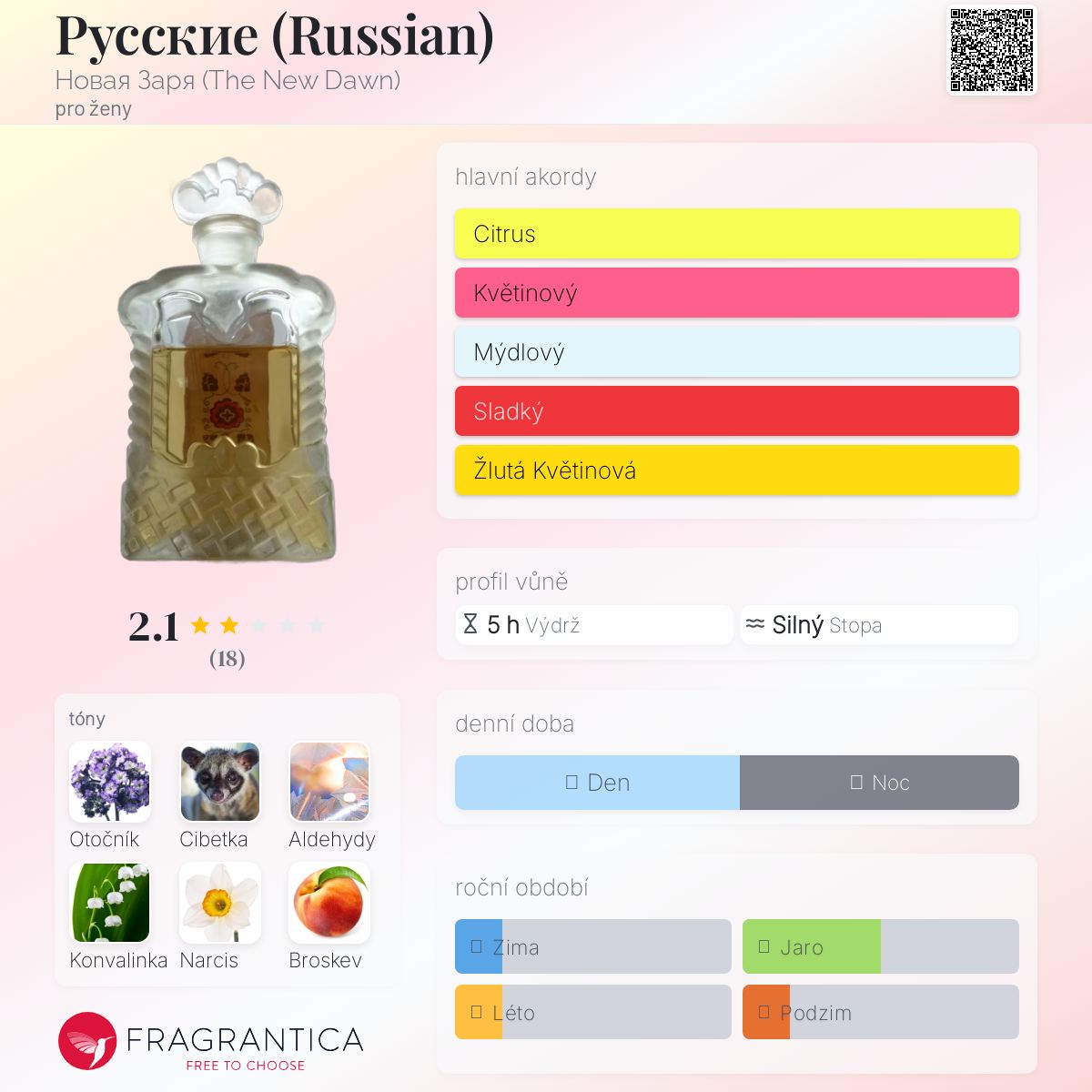 Русские (Russian) podle Новая Заря (The New Dawn) je Floral Aldehyde vůně pro ženy. Русские (Russian) byla spuštěna během 1950. Vrchní tóny jsou Aldehydy, Konvalinka, Narcis, Broskev, Jablko a Pomerančový květ; střední tóny jsouOtočník, Jasmín, Růže de Mai a Fialka ; základní tóny jsou Syntetická cibetka, Dřevité tóny, Zelené tóny a Pižmo.