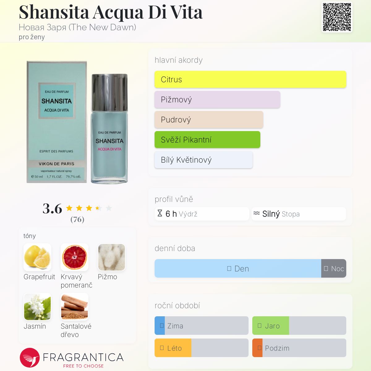 Shansita Acqua Di Vita podle Новая Заря (The New Dawn) je Citrus vůně pro ženy. Vrchní tóny jsou Grapefruit a Krvavý pomeranč; střední tón jeJasmín ; základní tóny jsou Pižmo a Santalové dřevo.