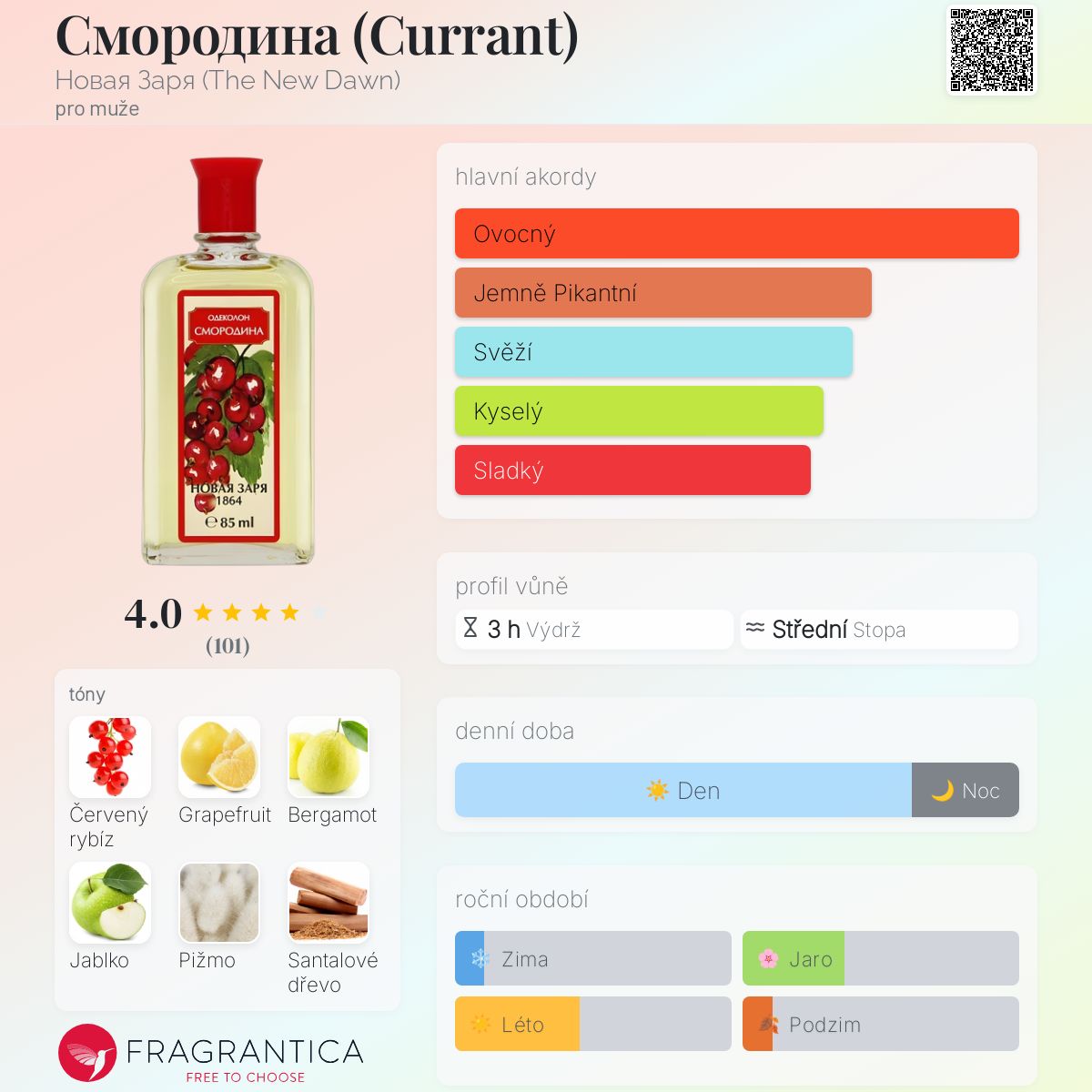 Смородина (Currant) podle Новая Заря (The New Dawn) je Floral Fruity vůně pro muže. Vrchní tóny jsou Grapefruit a Bergamot; střední tóny jsouČervený rybíz a Jablko ; základní tóny jsou Pižmo a Santalové dřevo.