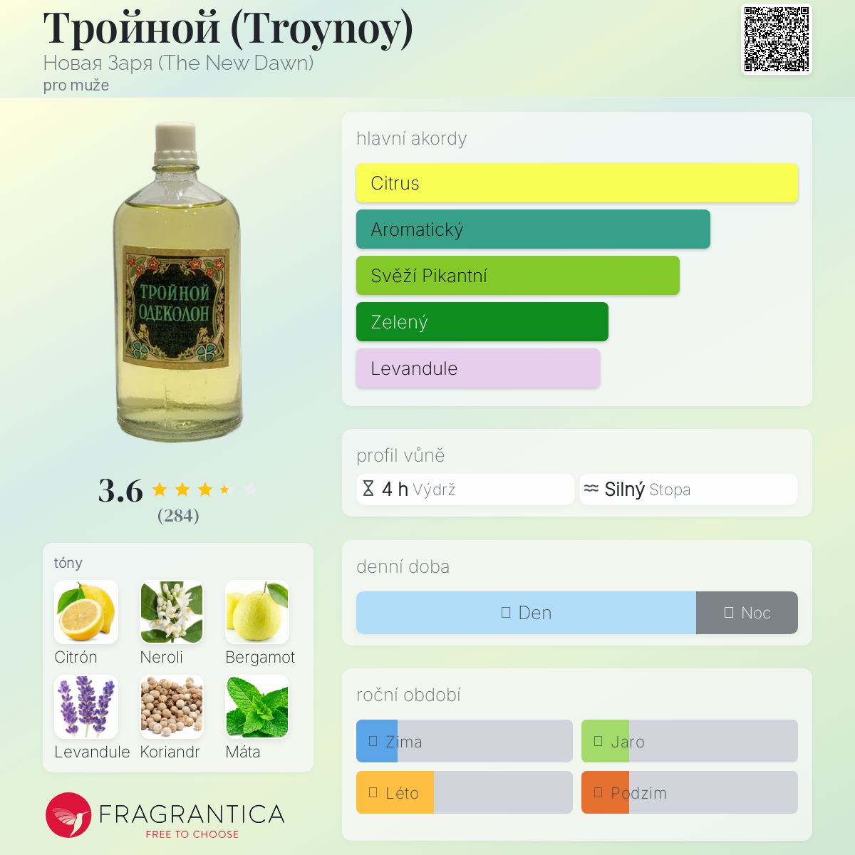 Тройной (Troynoy) podle Новая Заря (The New Dawn) je Citrus Aromatic vůně pro muže. Тройной (Troynoy) byl/a uveden/a v roce 1889. Vrchní tóny jsou Citron amalfi , Neroli a Bergamot; střední tóny jsouLevandule, Koriandr a Máta ; základní tóny jsou Muškátový oříšek, Jantar (ambra) a Pižmo.