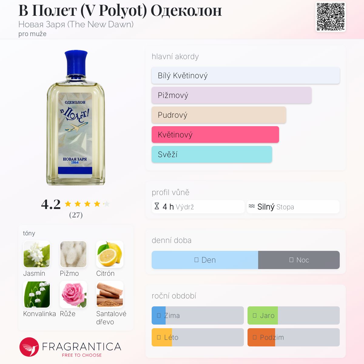 В Полет (V Polyot) Одеколон podle Новая Заря (The New Dawn) je Floral vůně pro muže. В Полет (V Polyot) Одеколон byla spuštěna během 1930. Vrchní tóny jsou Jasmín, Citrón a Konvalinka; střední tóny jsouRůže, Santalové dřevo a Brambořík ; základní tóny jsou Pižmo a Ambra.