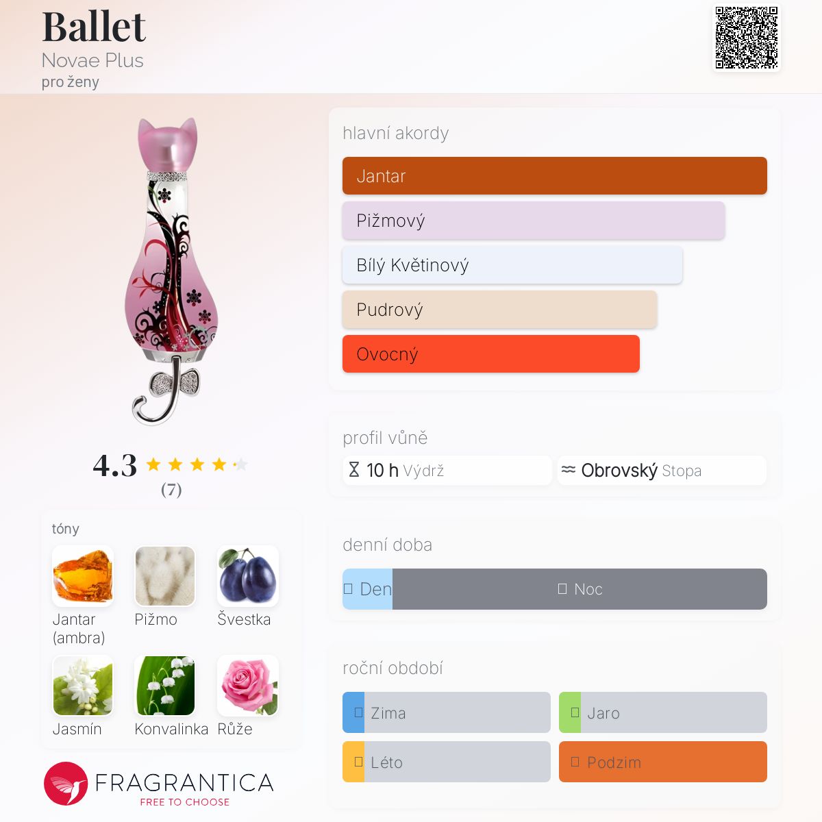 Ballet podle Novae Plus je Floral Fruity vůně pro ženy. Vrchní tóny jsou Švestka a Citrón; střední tóny jsouJasmín, Konvalinka a Růže ; základní tóny jsou Jantar (ambra) a Bílé pižmo.