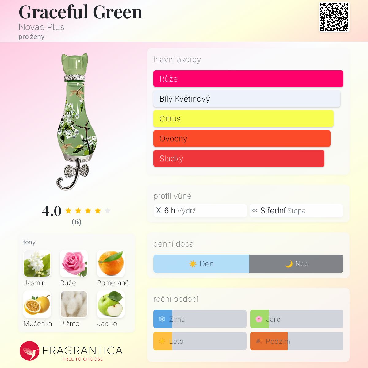 Graceful Green podle Novae Plus je Floral Woody Musk vůně pro ženy. Graceful Green byl/a uveden/a v roce 1999. Vrchní tóny jsou Pomeranč, Mučenka a Zelené jablko; střední tóny jsouJasmín, Růže a Brazilské růžové dřevo ; základní tóny jsou Pižmo, Jantar (ambra) a Cedr.
