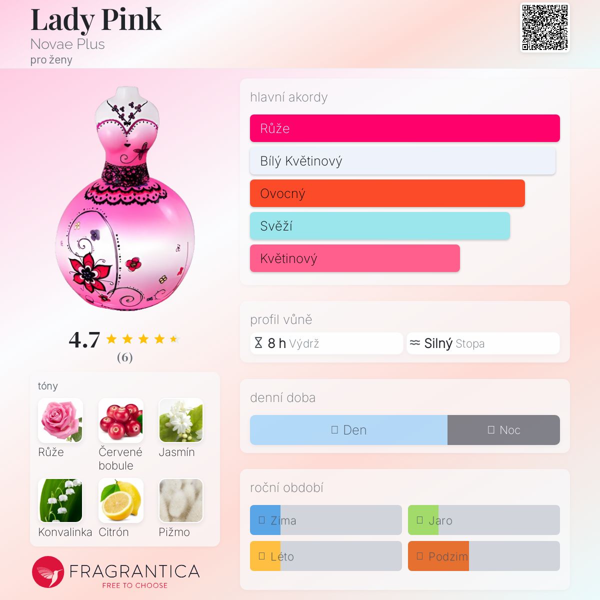 Lady Pink podle Novae Plus je vůně pro ženy. Vrchní tóny jsou Červené bobule a Citron amalfi; střední tóny jsouRůže, Jasmín a Konvalinka ; základní tóny jsou Pižmo, Santalové dřevo a Jantar (ambra).