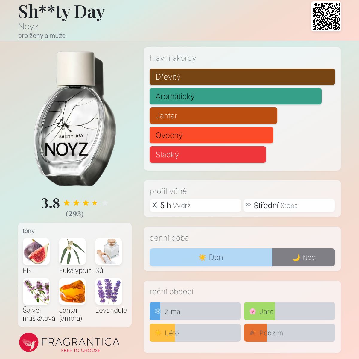 Sh**ty Day podle Noyz je Orientální vůně pro ženy a muže. Toto je nová vůně. Sh**ty Day byl/a uveden/a v roce 2024. "Nosem" za touto vůní je Jérôme Epinette. Vrchní tóny jsou Eukalyptus, Bergamot a Kokosová voda; střední tóny jsouFík, Sůl, Šalvěj muškátová, Levandule, Okurka a Fialka ; základní tóny jsou Jantar (ambra), Cedr a Fazole tonka.