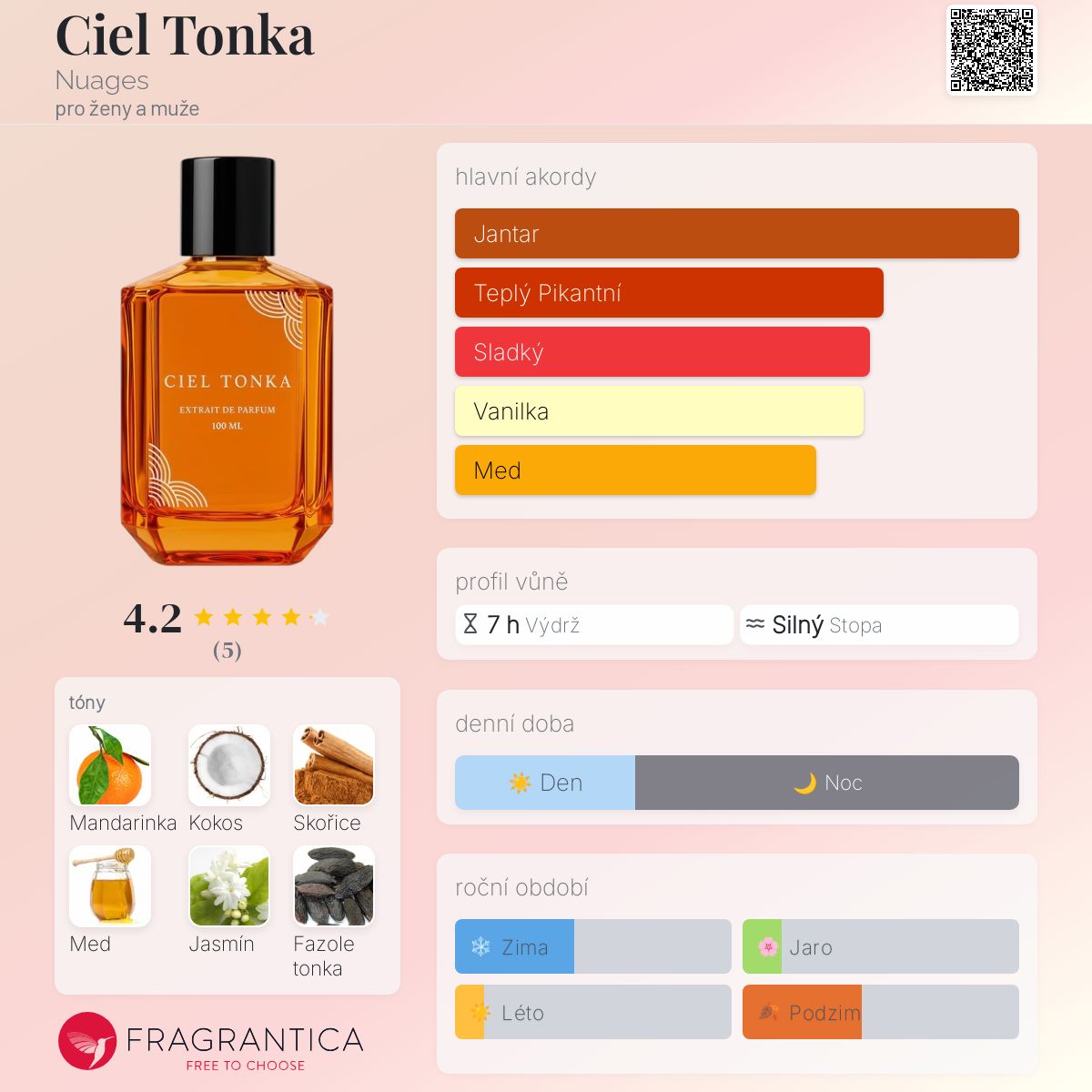 Ciel Tonka podle Nuages je Orientální Vanilla vůně pro ženy a muže. Toto je nová vůně. Ciel Tonka byl/a uveden/a v roce 2025. "Nosem" za touto vůní je François Robert. Vrchní tóny jsou Mandarinka a Kokos; střední tóny jsouSkořice, Med a Jasmín ; základní tóny jsou Fazole tonka, Benzoin, Jantar (ambra) a Vanilka.