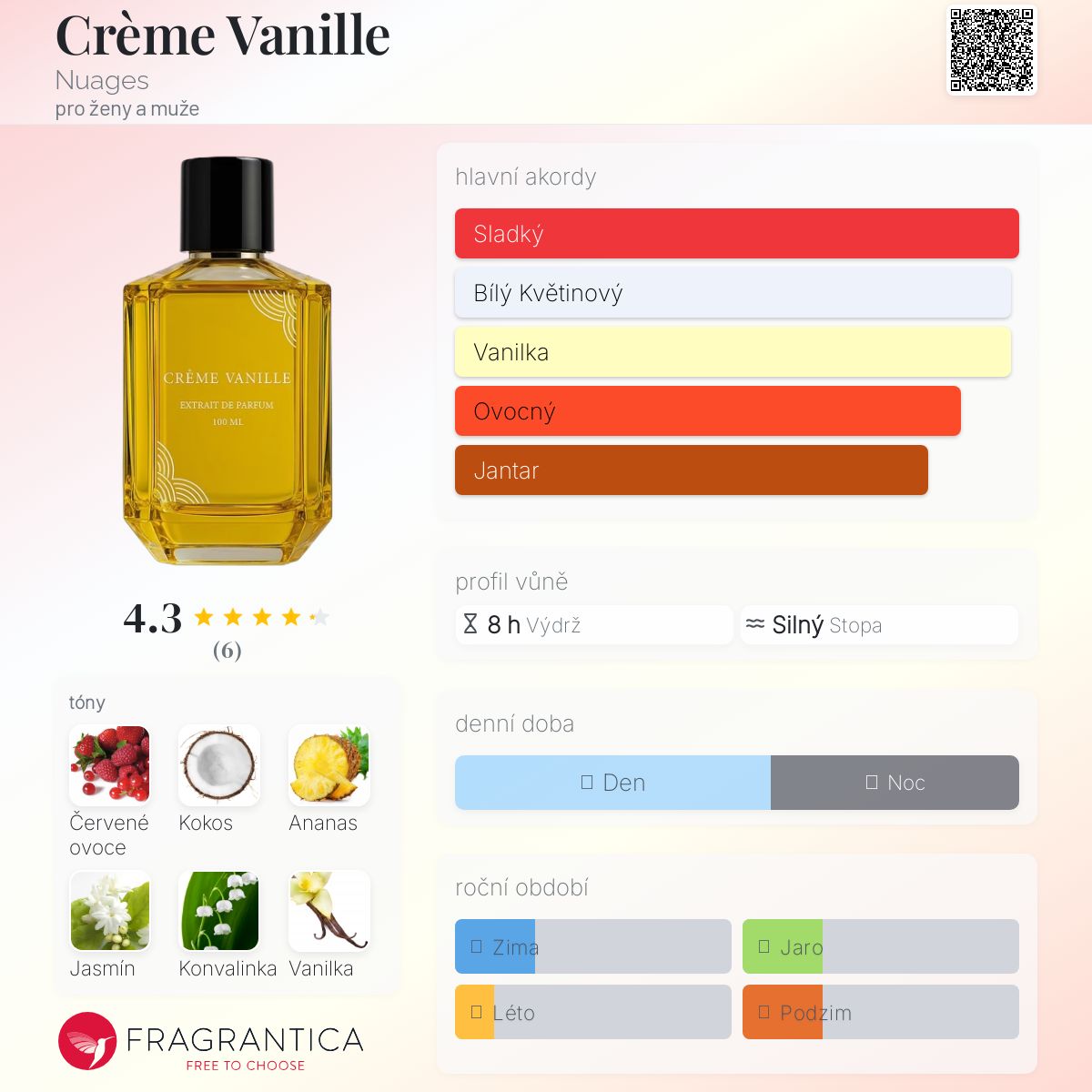 Crème Vanille podle Nuages je Orientální Vanilla vůně pro ženy a muže. Toto je nová vůně. Crème Vanille byl/a uveden/a v roce 2025. "Nosem" za touto vůní je François Robert. Vrchní tóny jsou Červené ovoce, Kokos a Ananas; střední tóny jsouJasmín a Konvalinka ; základní tóny jsou Vanilka, Fazole tonka, Jantar (ambra) a Dřevité tóny.