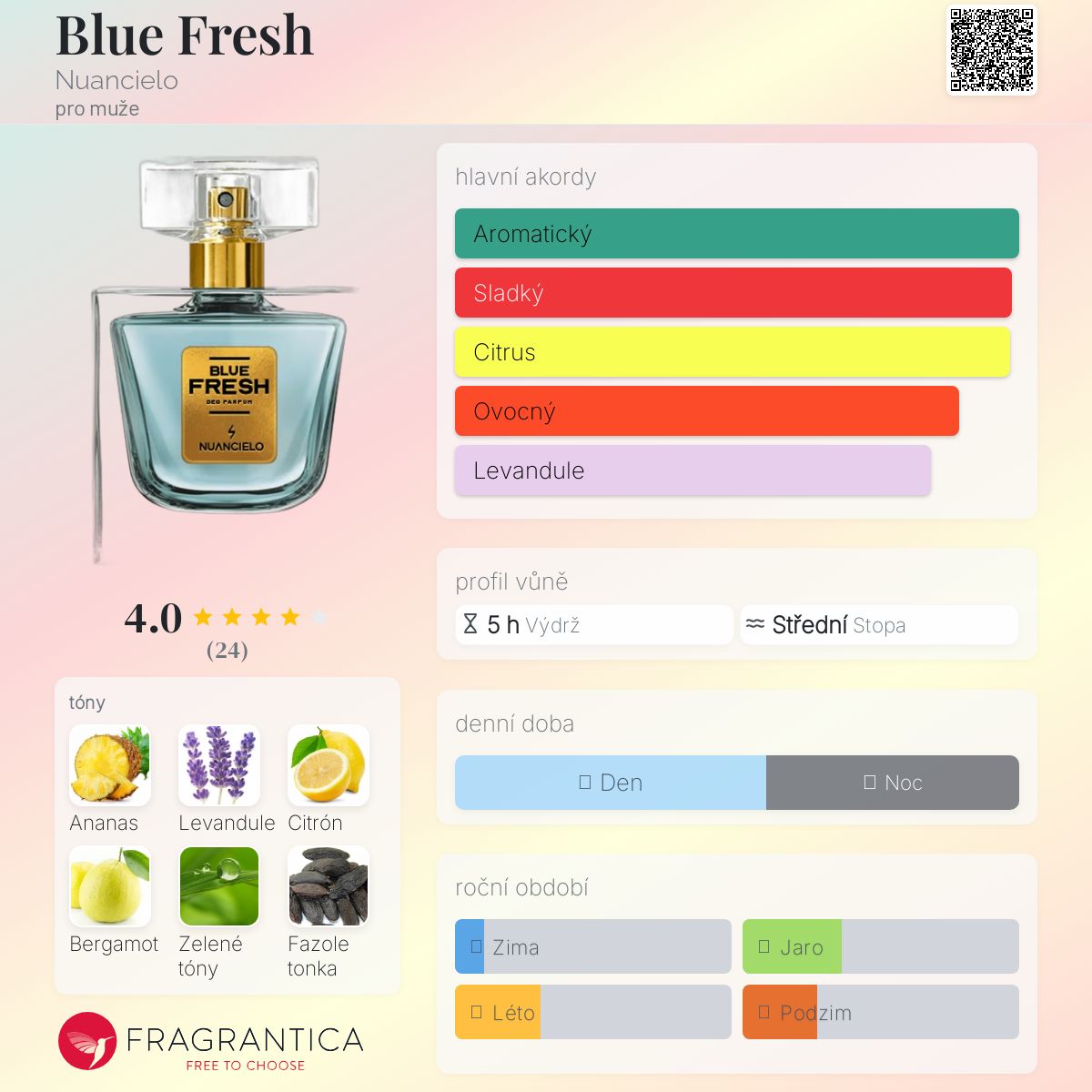 Blue Fresh podle Nuancielo je Orientální vůně pro muže. Blue Fresh byl/a uveden/a v roce 2020. Vrchní tóny jsou Ananas, Levandule, Sicilský citron, Bergamot, Zelené tóny a Jalovec; střední tóny jsouMandle, Jasmín, Brazilské růžové dřevo, Konvalinka, Pelargónie a Růže ; základní tóny jsou Fazole tonka, Pižmo a Jantar (ambra).