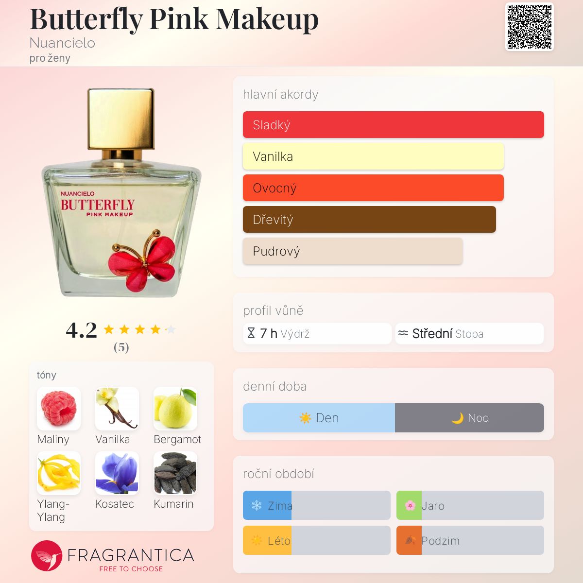 Butterfly Pink Makeup podle Nuancielo je Floral Fruity Gourmand vůně pro ženy. Toto je nová vůně. Butterfly Pink Makeup byl/a uveden/a v roce 2025. Vrchní tóny jsou Bergamot a Kosatec; střední tóny jsouMaliny, Ylang-Ylang a Hruška ; základní tóny jsou Bourbonská vanilka, Kumarin a Santalové dřevo.