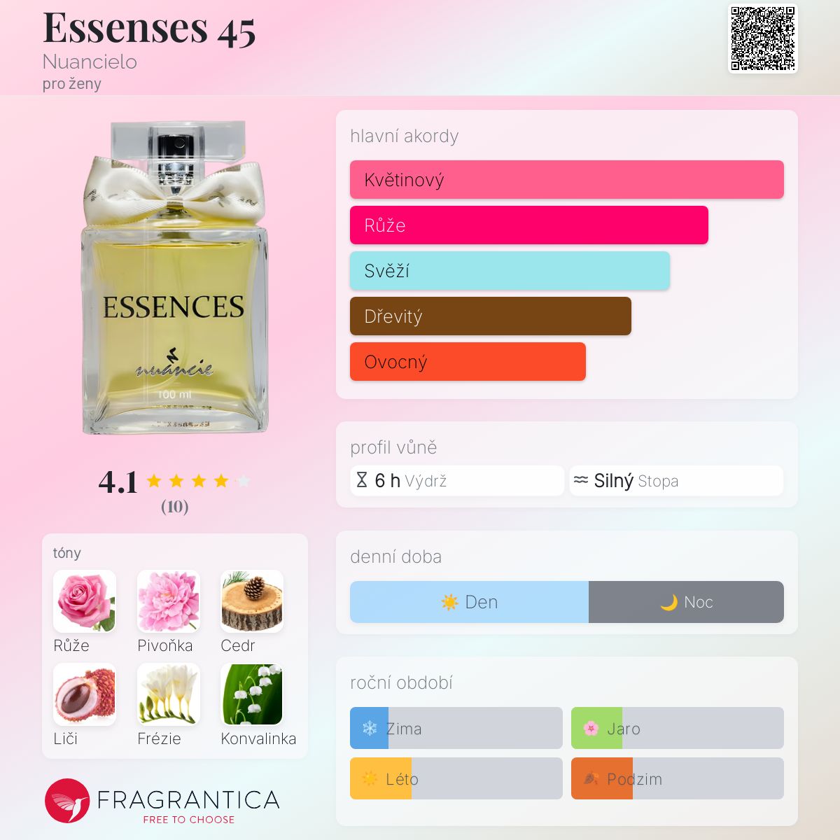 Essenses 45 podle Nuancielo je Floral vůně pro ženy. Essenses 45 byl/a uveden/a v roce 2017. Vrchní tóny jsou Pivoňka, Liči a Frézie; střední tóny jsouRůže, Konvalinka a Magnólie ; základní tóny jsou Virginský cedr a Jantar (ambra).
