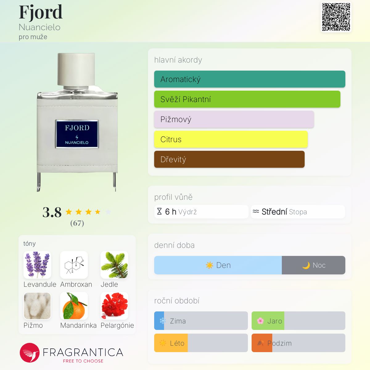 Fjord podle Nuancielo je Woody Aromatic vůně pro muže. Fjord byl/a uveden/a v roce 2022. Vrchní tóny jsou Levandule, Mandarinka, Pelargónie a Bergamot; střední tóny jsouHedione, Jasmín, Koriandr a Fialka ; základní tóny jsou Ambroxan, Jedle balzámová, Pižmo a Dřevité tóny.