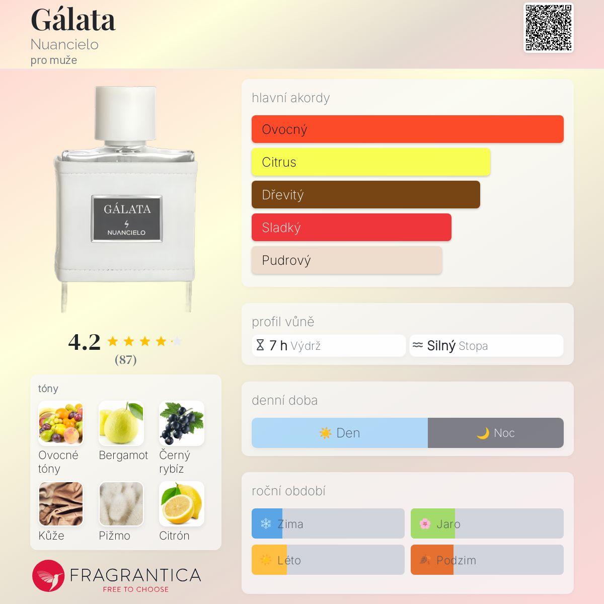 Gálata podle Nuancielo je Citrus Aromatic vůně pro muže. Gálata byl/a uveden/a v roce 2022. Vrchní tóny jsou Bergamot, Černý rybíz, Sicilský citron a Kořeněné tóny; střední tóny jsouOvoce, Vodní jasmín a List pačuli ; základní tóny jsou Kůže, Bílé pižmo, Vanilka, Mech, Cedr a Santalové dřevo.