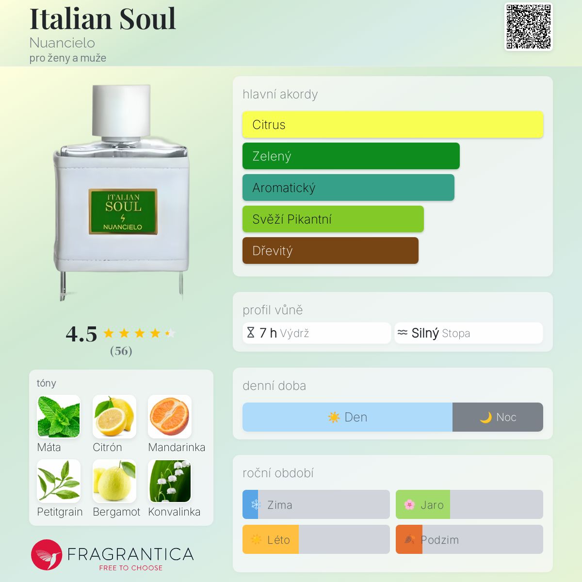 Italian Soul podle Nuancielo je vůně pro ženy a muže. Toto je nová vůně. Italian Soul byl/a uveden/a v roce 2024. Vrchní tóny jsou Citron amalfi , Mandarinka, Petitgrain a Bergamot; střední tóny jsouMáta, Konvalinka a Růže ; základní tóny jsou Virginský cedr, Pižmo, Pačuli a Jantar (ambra).
