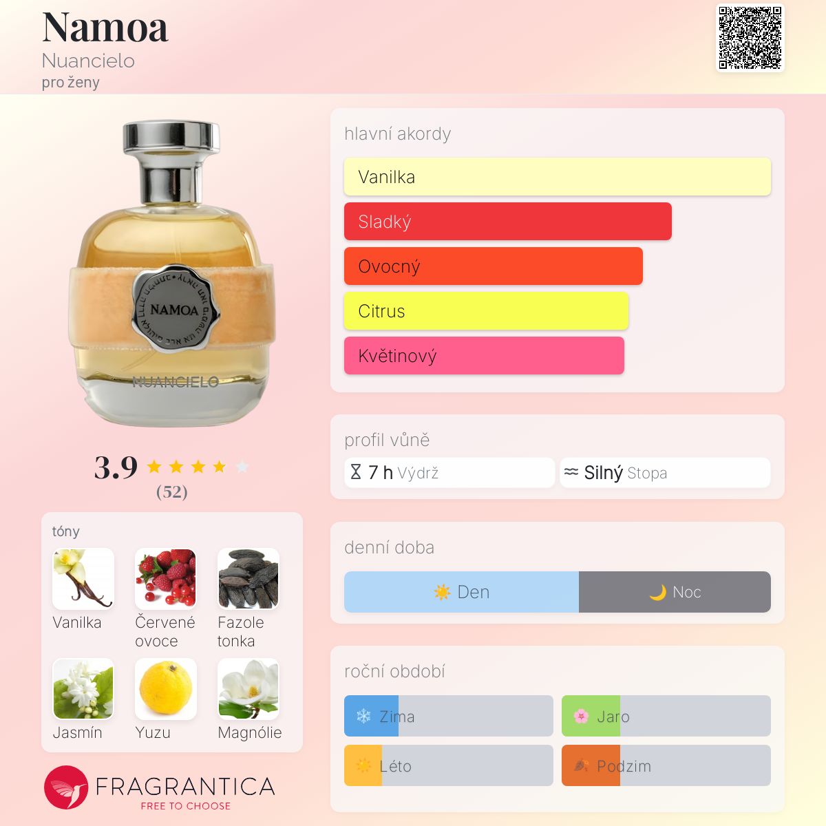 Namoa podle Nuancielo je Chypre Floral vůně pro ženy. Namoa byl/a uveden/a v roce 2021. Vrchní tóny jsou Červené ovoce a Yuzu; střední tóny jsouJasmín, Magnólie a Fialka ; základní tóny jsou Vanilka, Fazole tonka, Pižmo a Santalové dřevo.