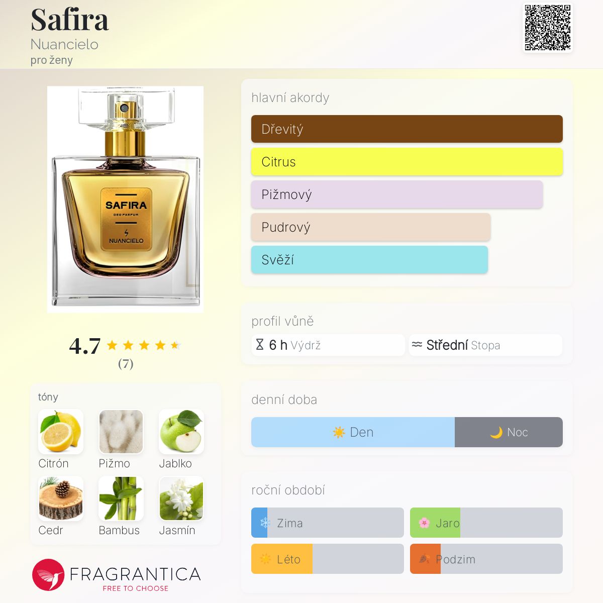 Safira podle Nuancielo je Floral Fruity vůně pro ženy. Toto je nová vůně. Safira byl/a uveden/a v roce 2025. Vrchní tóny jsou Sicilský citron, Jablko, Cedr a Zvonek; střední tóny jsouBambus, Jasmín a Bílá růže ; základní tóny jsou Pižmo, Cedr a Jantar (ambra).