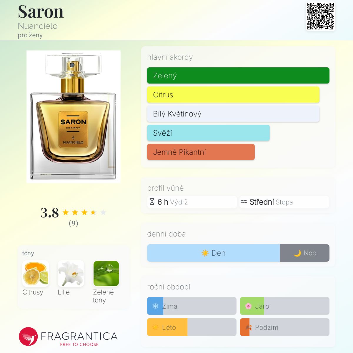 Saron podle Nuancielo je Floral vůně pro ženy. Saron byl/a uveden/a v roce 2023. Vrchní tóny jsou Lilie a Citrusy; střední tón jeLilie ; základní tóny jsou Zelená lilie a Zelené tóny.