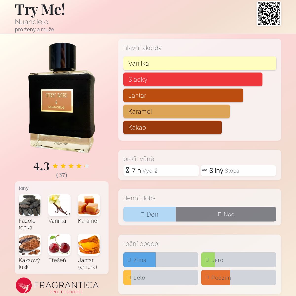 Try Me! podle Nuancielo je Orientální Vanilla vůně pro ženy a muže. Try Me! byl/a uveden/a v roce 2023. Vrchní tóny jsou Levandule a Bergamot; střední tóny jsouTřešeň, Jasmín a Frézie ; základní tóny jsou Fazole tonka, Vanilka, Karamel, Kakao, Jantar (ambra) a Cedr.