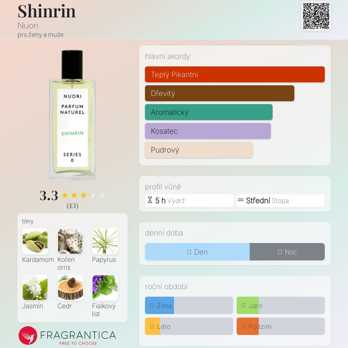 Shinrin podle Nuori je Woody Aromatic vůně pro ženy a muže. Toto je nová vůně. Shinrin byl/a uveden/a v roce 2024. "Nosem" za touto vůní je Euan McCall. Vrchní tóny jsou Kardamom, Fialkový list a Bergamot; střední tóny jsouOrris, Jasmín a Kadidlo ; základní tóny jsou Papyrus, Cedr, Santalové dřevo, Dubový mech, Vetiver a Pižmo.