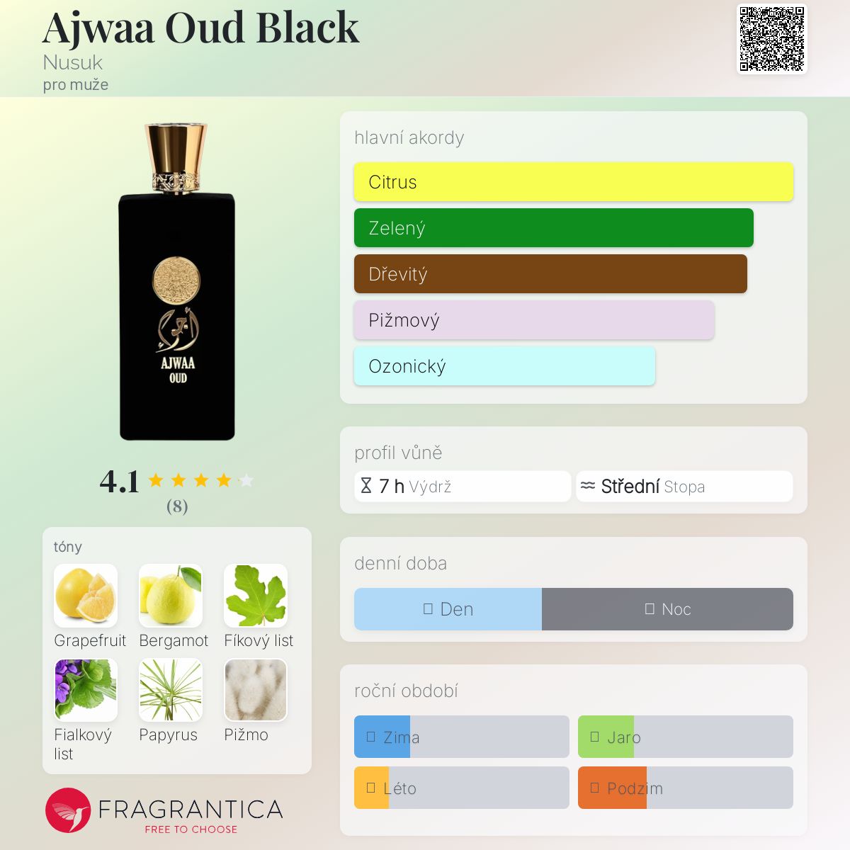 Ajwaa Oud Black podle Nusuk je Orientální Woody vůně pro muže. Ajwaa Oud Black byl/a uveden/a v roce 2019. Vrchní tóny jsou Grapefruit, Bergamot a Fíkový list; střední tóny jsouFialkový list a Papyrus ; základní tóny jsou Pižmo, Pačuli a Ambroxan.