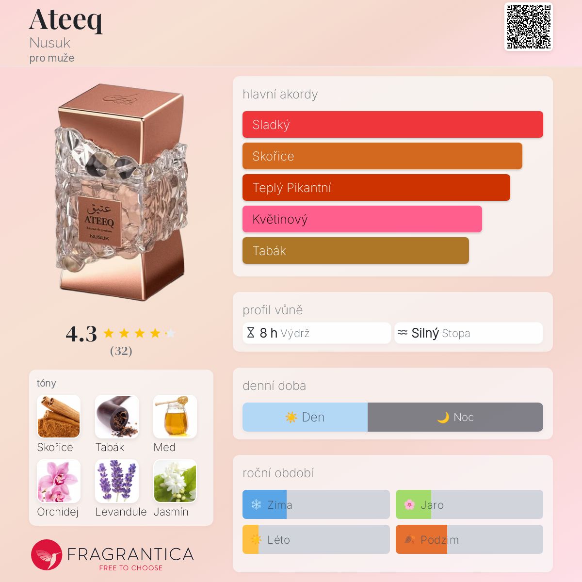 Ateeq podle Nusuk je Aromatic vůně pro muže. Toto je nová vůně. Ateeq byl/a uveden/a v roce 2025. Vrchní tóny jsou Skořice, Med, Jantar (ambra), Grapefruit a Limetka; střední tóny jsouTabák, Levandule a Jasmín ; základní tóny jsou Vanilková orchidej, Cedr, Fazole tonka, Kumarin a Pižmo.