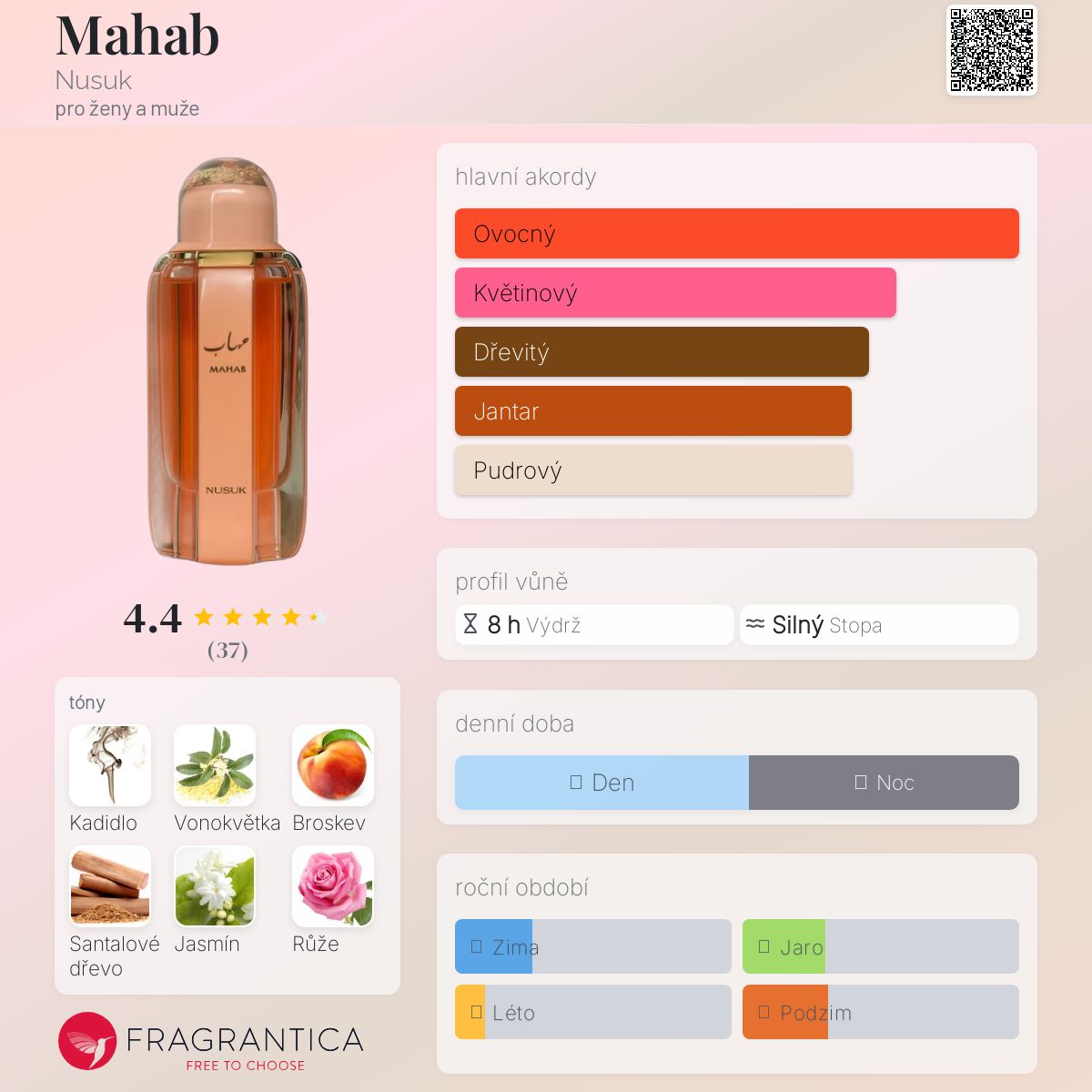 Mahab podle Nusuk je Floral vůně pro ženy a muže. Toto je nová vůně. Mahab byl/a uveden/a v roce 2025. Vrchní tóny jsou Kadidlo, Červené ovoce a Fenykl; střední tóny jsouVonokvětka, Broskev a Jasmín ; základní tóny jsou Santalové dřevo, Růže a Pižmo.
