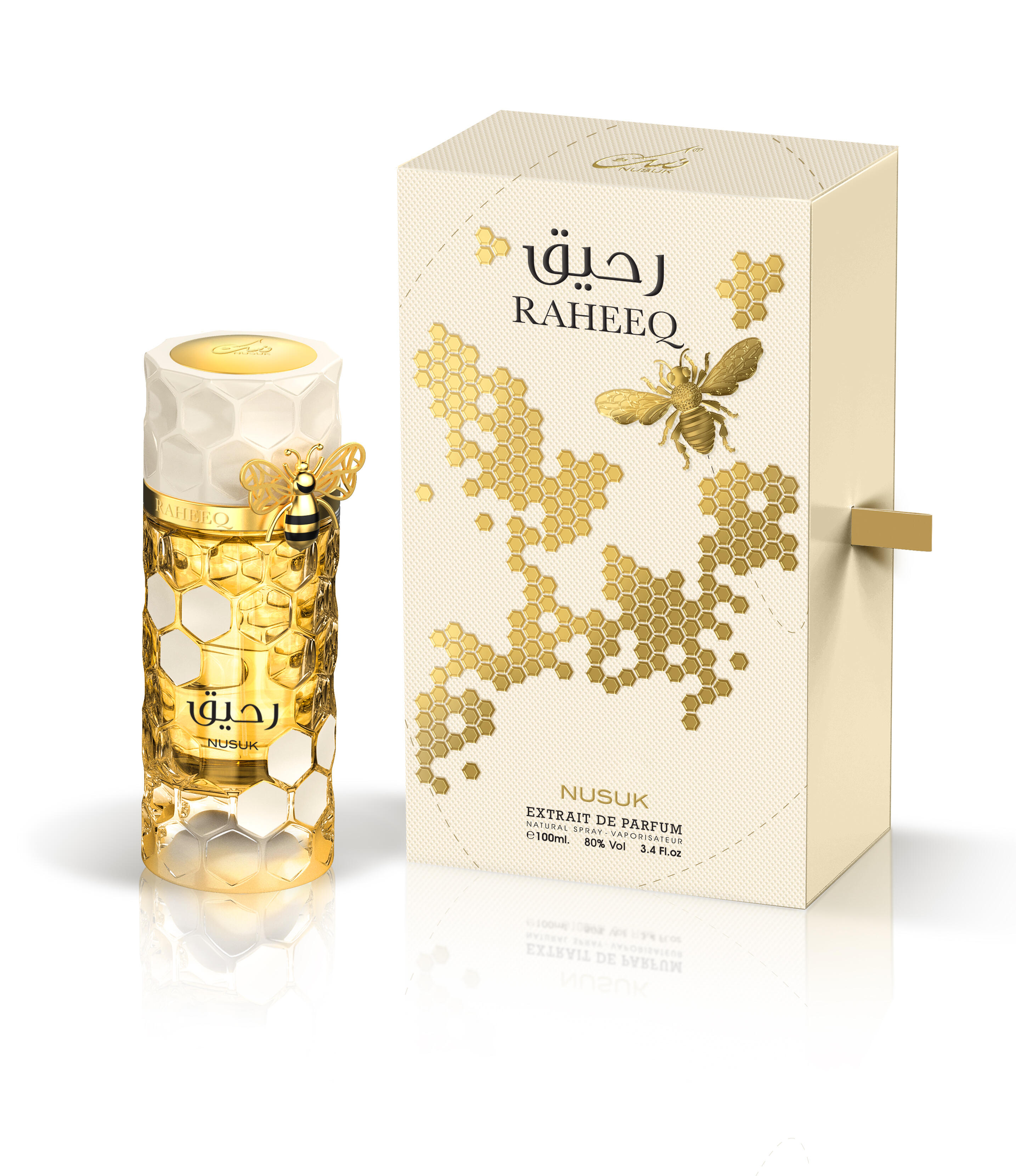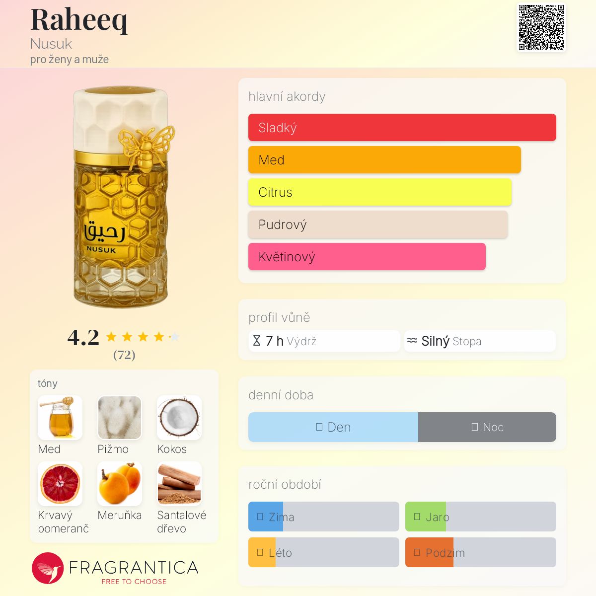 Raheeq podle Nusuk je Orientální Vanilla vůně pro ženy a muže. Toto je nová vůně. Raheeq byl/a uveden/a v roce 2025. Vrchní tóny jsou Med, Krvavý pomeranč, Meruňka a Citrón; střední tóny jsouKokos, Karamel a Magnólie ; základní tóny jsou Pižmo, Vanilka a Santalové dřevo.