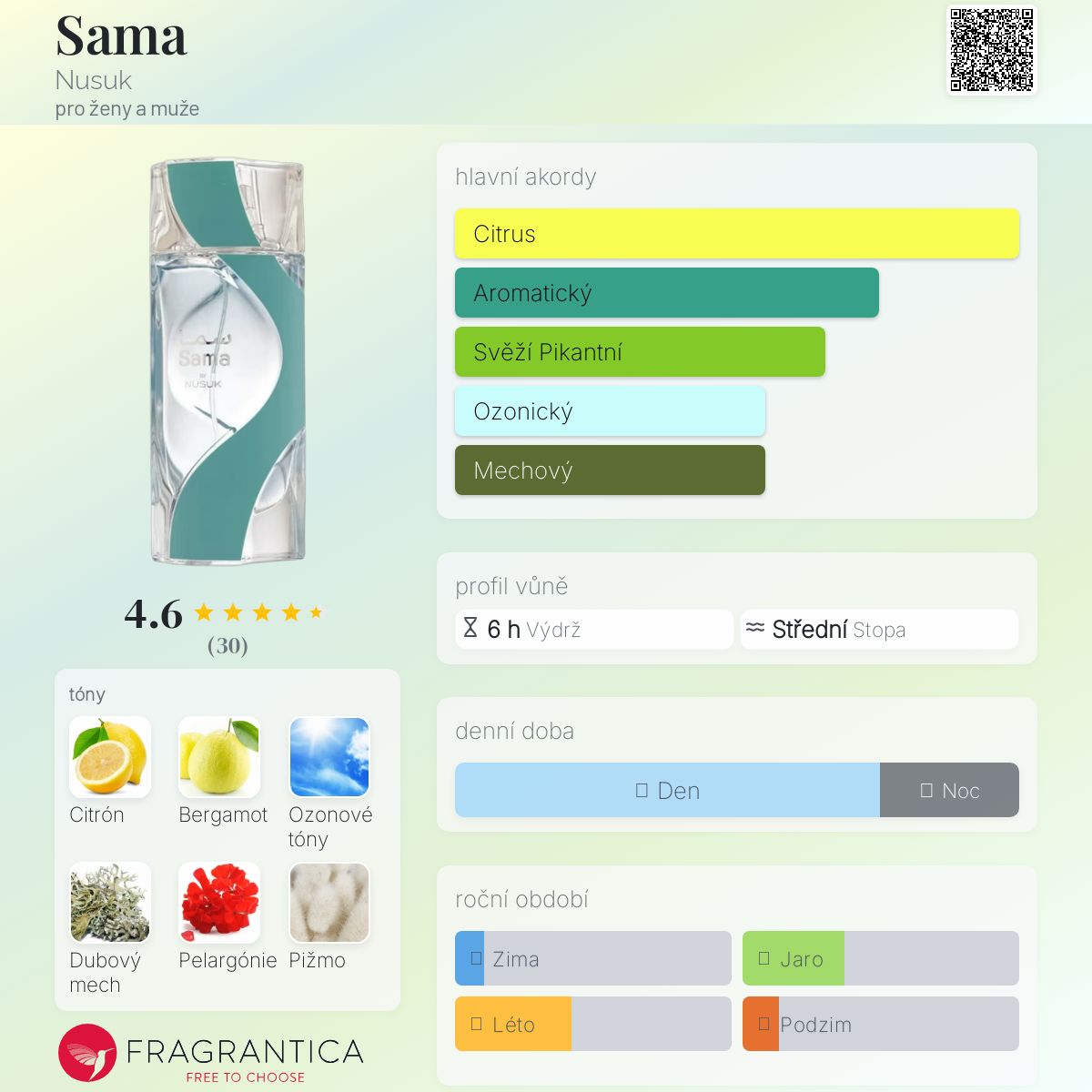 Sama podle Nusuk je Aromatic Aquatic vůně pro ženy a muže. Toto je nová vůně. Sama byl/a uveden/a v roce 2025. Vrchní tóny jsou Citrón a Bergamot; střední tóny jsouOzonové tóny, Pelargónie a Šalvěj ; základní tóny jsou Mech, Pižmo a Jemný jantar (ambra).