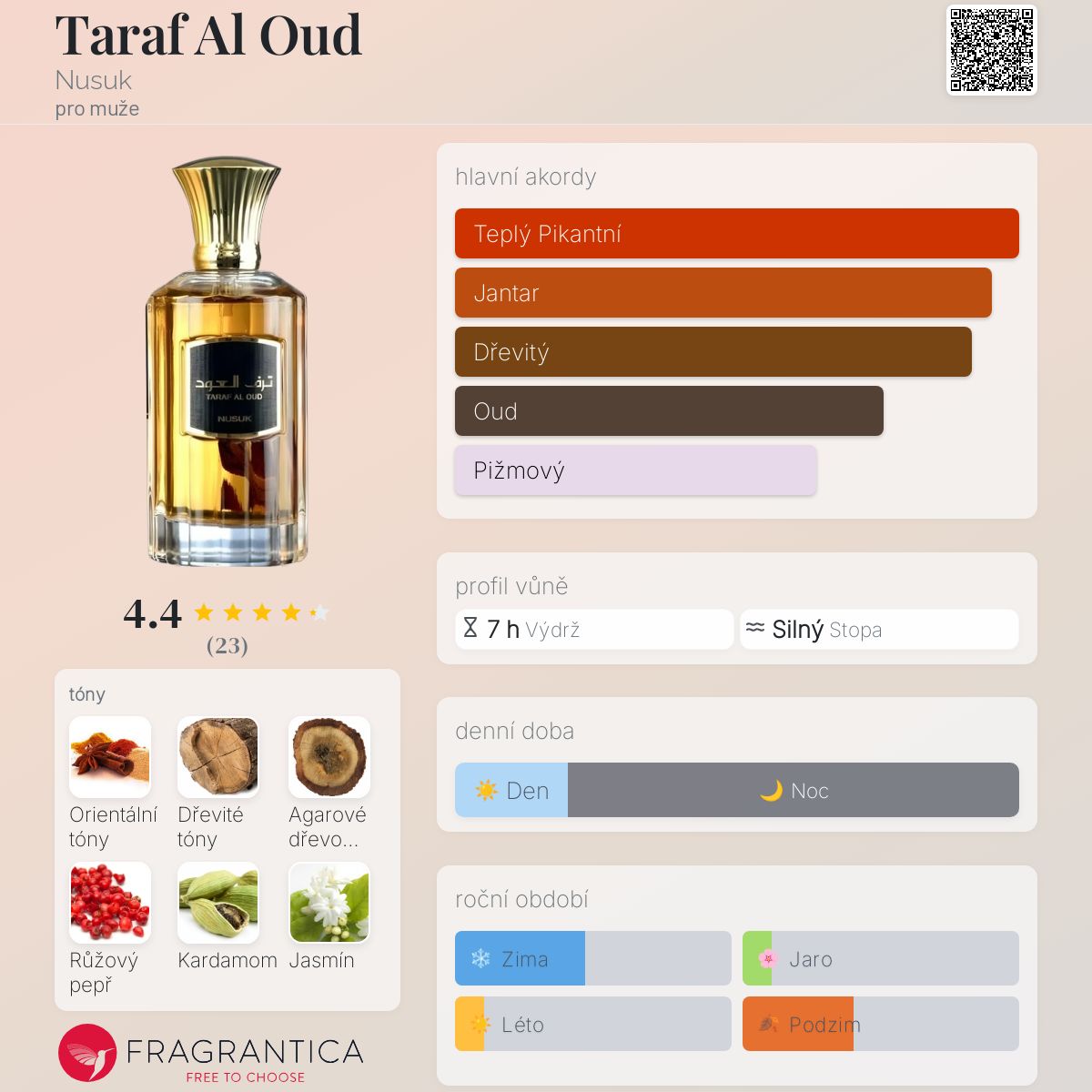 Taraf Al Oud podle Nusuk je Orientální Woody vůně pro muže. Taraf Al Oud byl/a uveden/a v roce 2020. Vrchní tóny jsou Růžový pepř a Kardamom; střední tóny jsouJasmín Sambac a Semiš ; základní tóny jsou Agarové dřevo (oud), Jantar (ambra) a Mech.