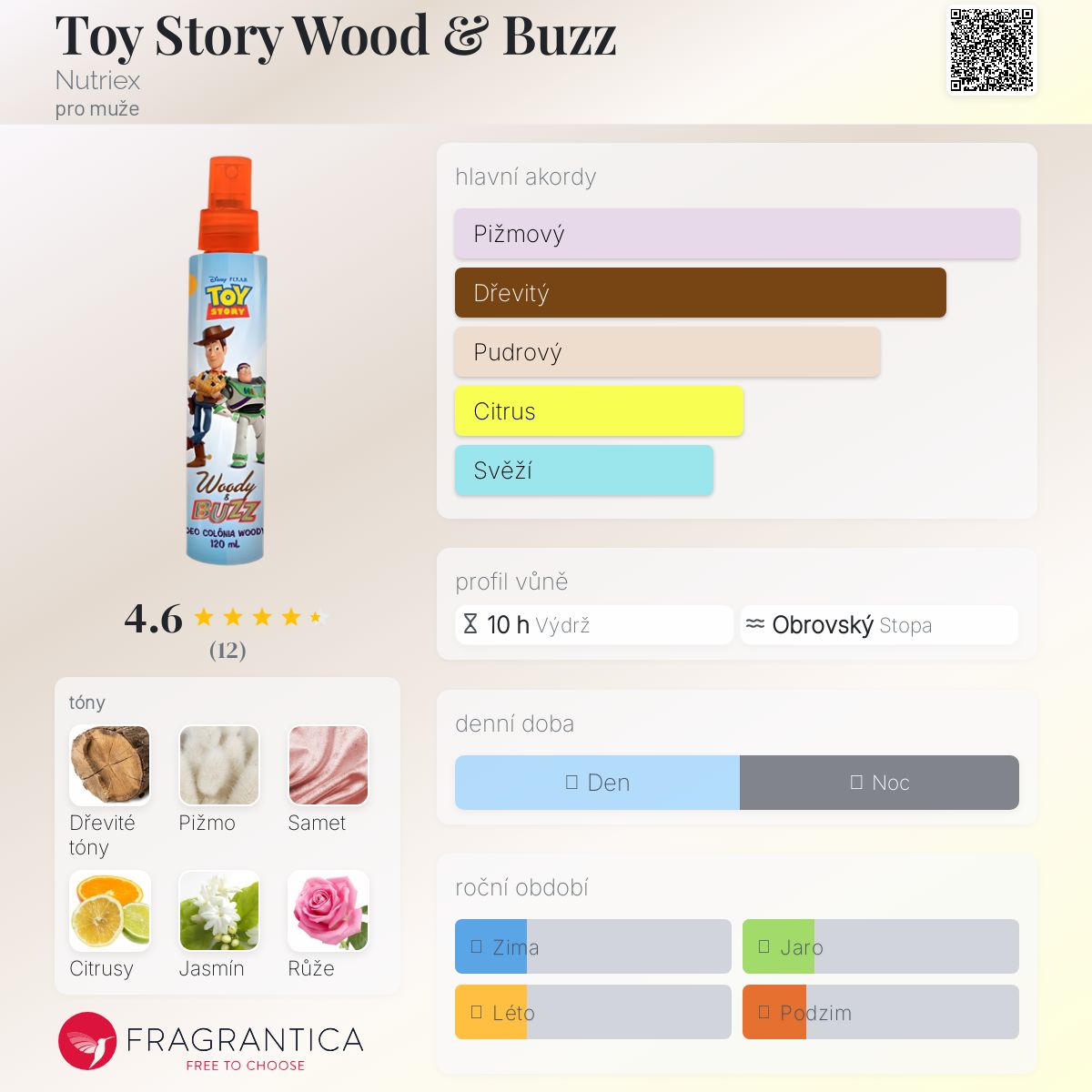 Toy Story Wood & Buzz podle Nutriex je Citrus vůně pro muže. Toy Story Wood & Buzz byl/a uveden/a v roce 2019. Vrchní tón je Citrusy ; střední tóny jsouJasmín a Růže ; základní tóny jsou Vzácné dřevo, Pižmo a Samet.