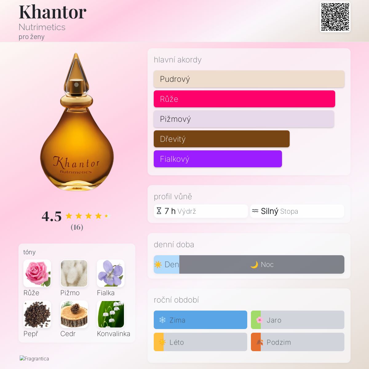 Khantor podle Nutrimetics je Floral Woody Musk vůně pro ženy. Khantor byla spuštěna během 2000. Vrchní tóny jsou Pepř, Ylang-Ylang a Bergamot; střední tóny jsouRůže, Fialka, Virginský cedr a Konvalinka ; základní tóny jsou Pižmo, Santalové dřevo a Vanilka.