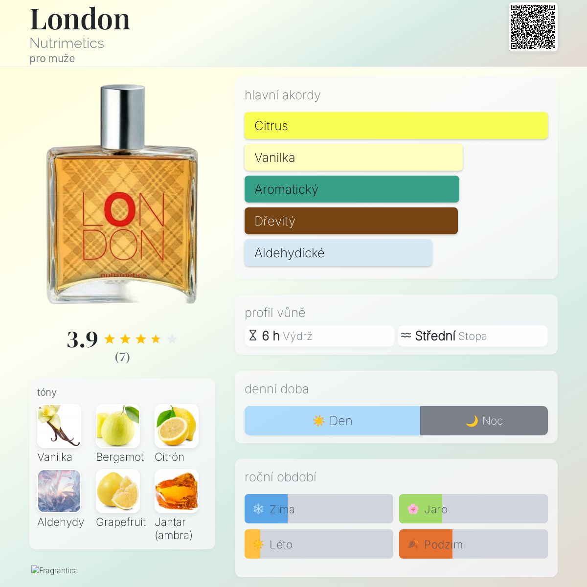 London podle Nutrimetics je Orientální Woody vůně pro muže. Vrchní tóny jsou Bergamot, Citrón, Aldehydy, Grapefruit, Zelené tóny a Káva; střední tóny jsouLevandule, Růžový pepř, Šalvěj, Šafrán a Jasmín ; základní tóny jsou Vanilka, Jantar (ambra), Santalové dřevo, Vetiver, Cedr a Pačuli.