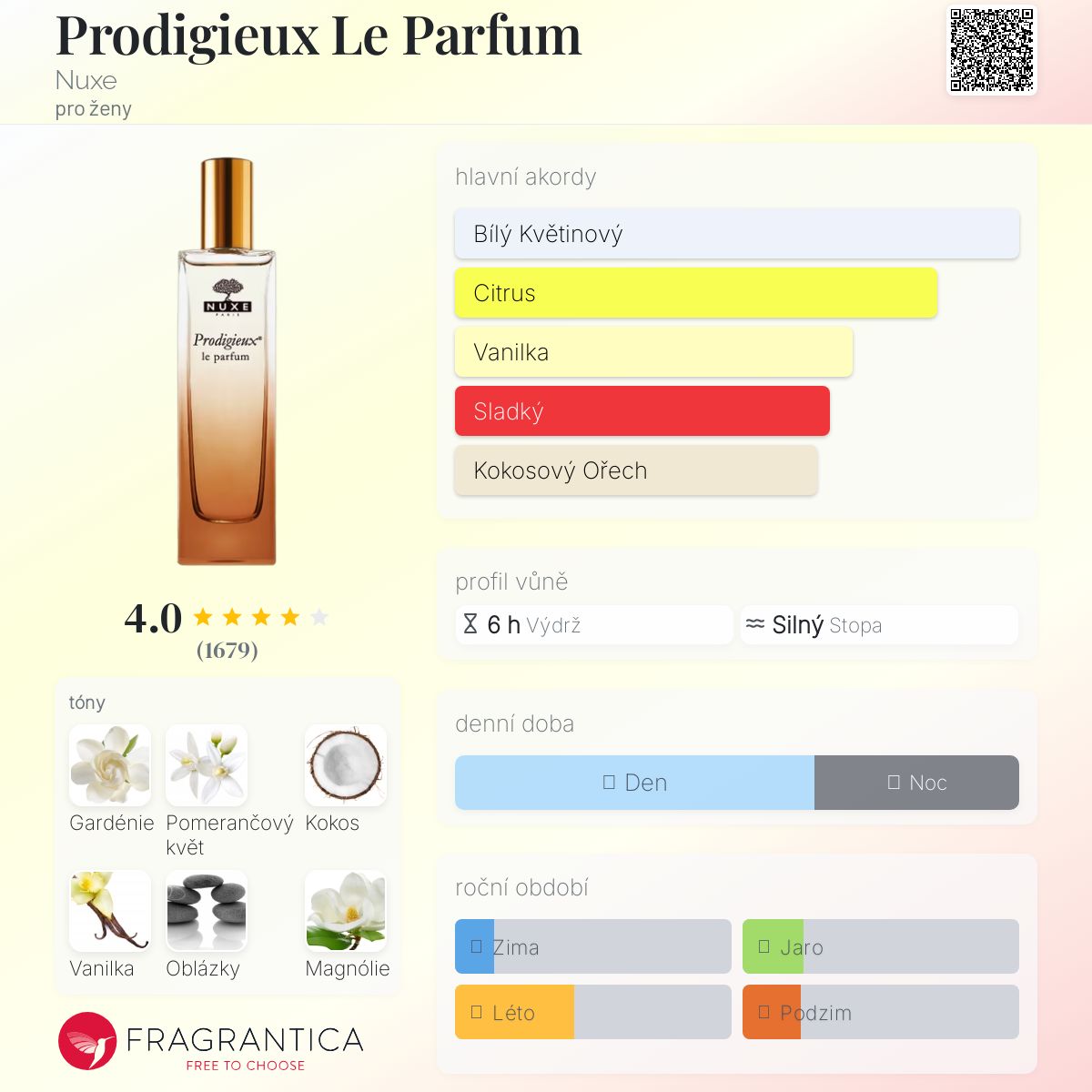 Prodigieux Le Parfum podle Nuxe je Floral vůně pro ženy. Prodigieux Le Parfum byl/a uveden/a v roce 2012. "Nosem" za touto vůní je Serge Majoullier. Vrchní tóny jsou Pomerančový květ, Mandarinka, Pomeranč a Bergamot; střední tóny jsouGardénie, Magnólie a Růže ; základní tóny jsou Kokosové mléko, Vanilka a Oblázky.